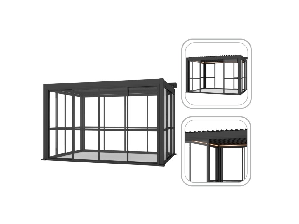 Posuvné dvere sú kompletným modulom so šírkou 4 metre, určeným okrem iného pre pergoly tejto veľkosti. Systém bol vyvinutý s cieľom zvýšiť funkčnosť krytých priestorov tým, že ich chráni pred vetrom, dažďom a nadmerným slnečným žiarením, pričom zachováva vysokú priepustnosť svetla.Konštrukcia je založená na sivom hliníkovom ráme a 3 mm hrubých polykarbonátových paneloch, ktoré sú odolné voči nárazom, rozmerovo stabilné a odolné voči vonkajšiemu pôsobeniu. Vodiace lišty zabezpečujú plynulý pohyb krídel a pohodlné ovládanie. Technické