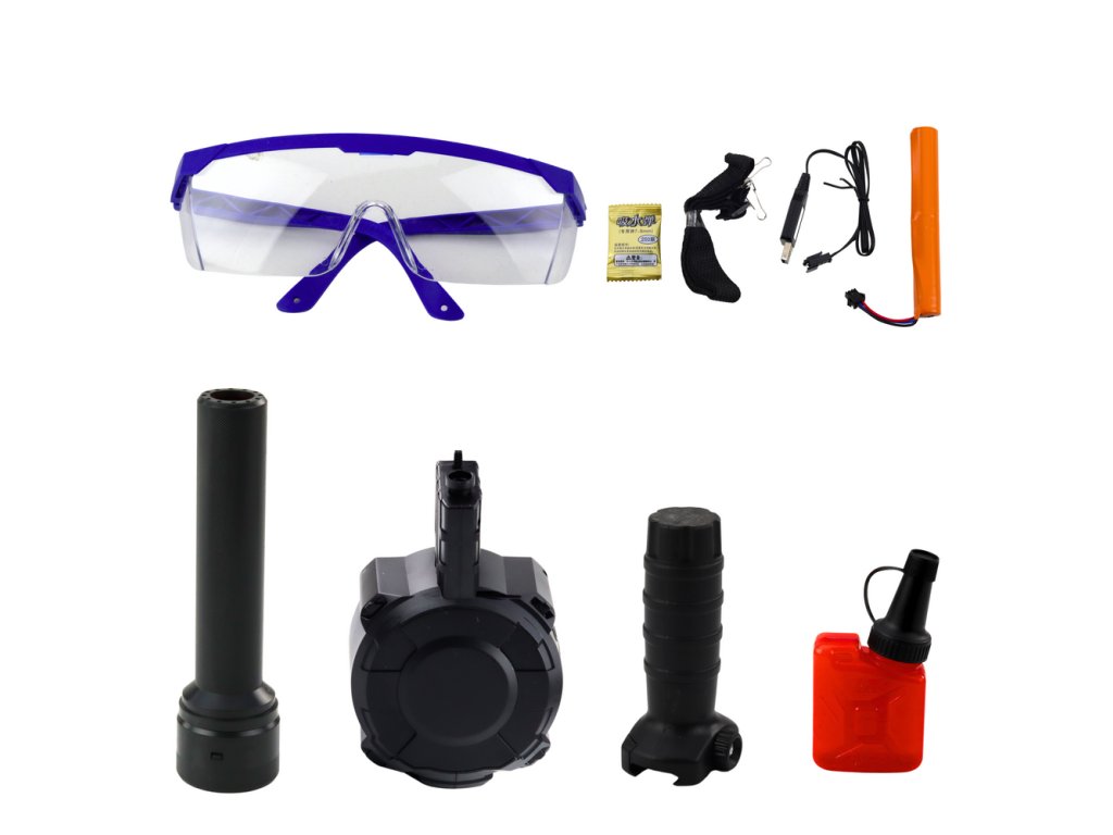 Ďalšou výhodou sady sú vodné guľôčky (tzv. hydrogélové guľôčky), ktoré po namočení do vody nabobtnajú a zmäknú. Keď zasiahnu cieľ, rozpadnú sa bez toho, aby spôsobili bolesť alebo zanechali nejaké zvyšky, čím sú úplne bezpečné a šetrné k životnému prostrediu. Súprava obsahuje aj fľašu na jednoduché dávkovanie guličiek a montážne prvky.