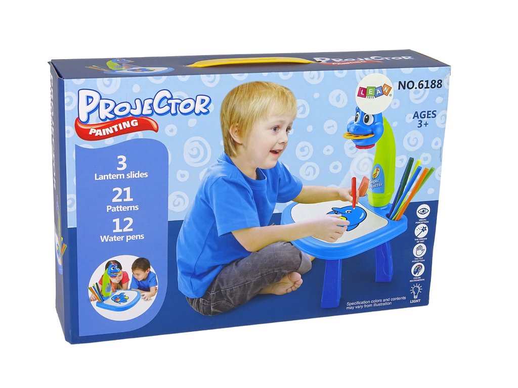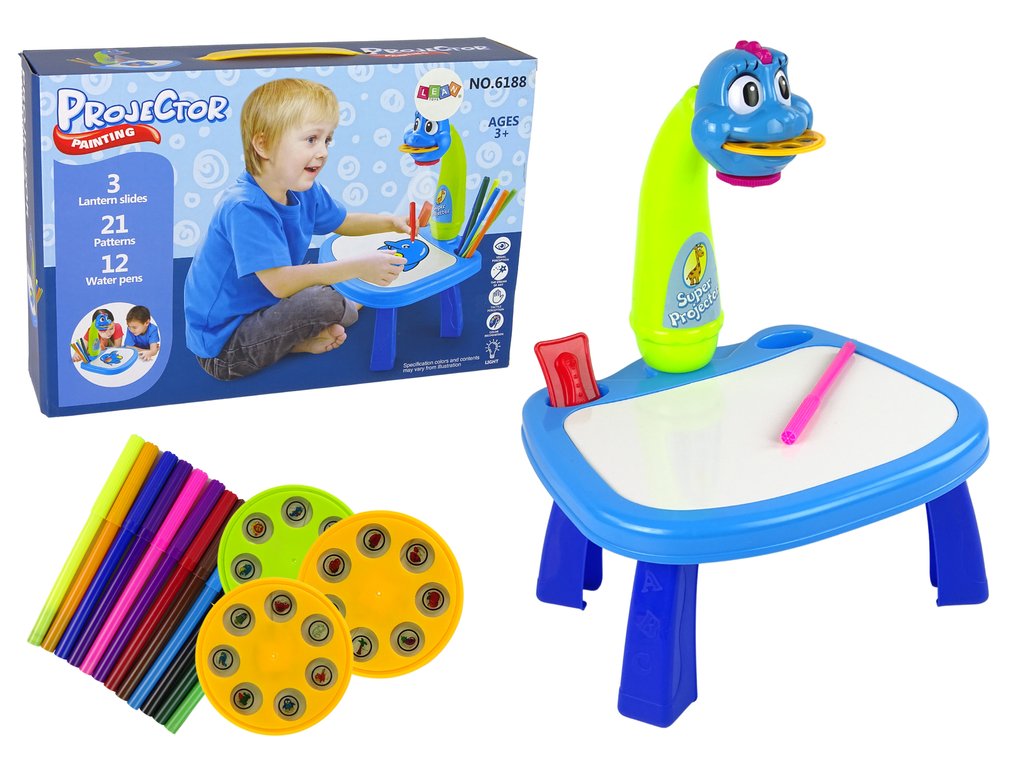 Špeciálny projektor v tvare hlavy dinosaura premieta obrázky na tabuľu, ktoré deti môžu obkresľovať pomocou priložených fixiek. Stôl s projektorom je fantastická hračka a skvelý gadget pre všetky deti, ktoré milujú kreslenie. Hranie je veľmi jednoduché: pripevnite nožičky k tabuli a umiestnite projektor s hlavou dinosaura do stredu. Vložte jeden z diapozitívov do hlavy dinosaura. Zapnite projektor pohybom prepínača umiestneného v hornej časti. Projektor premietne obrázok z diapozitívu na tabuľu.