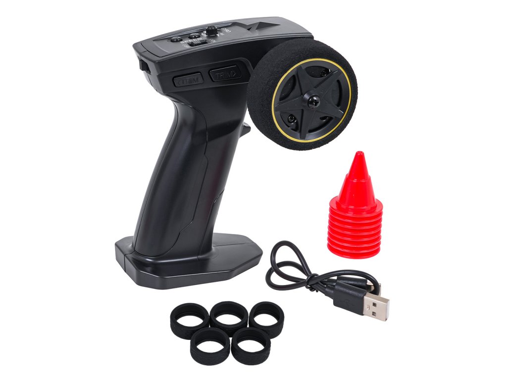 - driftové vozidlo, - diaľkové ovládanie R/C, - nabíjací kábel typu C, - používateľská príručka, - 5 náhradných pneumatík, - 8 kužeľov, prekážka. |