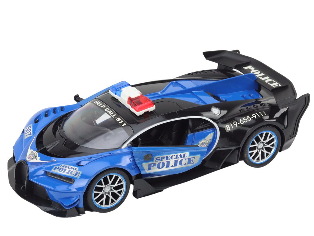 Replika policajného auta má športový dizajn, ktorý okamžite upúta pozornosť. Modrá farba mu dodáva autentický vzhľad a proporcie a detaily sú verne reprodukované zo skutočného vozidla.