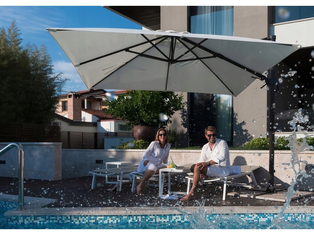 Slnečník je vyrobený z vysoko kvalitných materiálov. Je vyrobený z nepremokavej tkaniny, vďaka čomu je 100 % odolný voči poveternostným vplyvom. Sklopenie a rozloženie je jednoduché vďaka kľuke. Na rozdiel od produktov našich konkurentov má náš slnečník veľký a pevný stojan vyrobený z práškovo lakovanej ocele! Jeho stabilitu zabezpečujú špeciálne otvory v ráme alebo špeciálne závažia (treba zakúpiť samostatne), ktoré slúžia na upevnenie slnečníka k zemi. Vďaka týmto vlastnostiam je menej pravdepodobné, že sa prevráti!