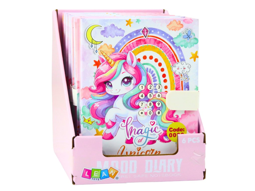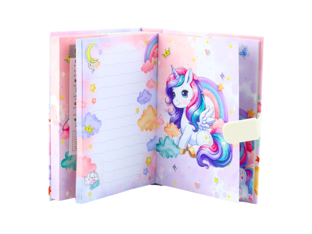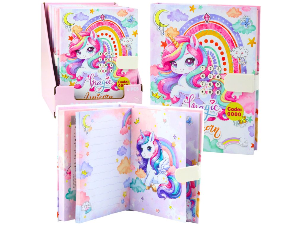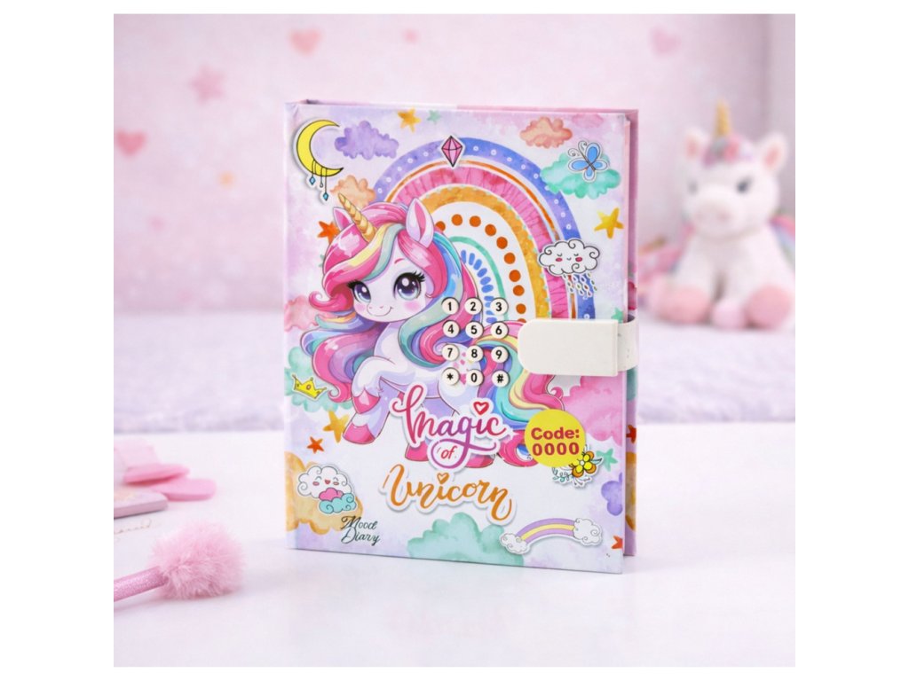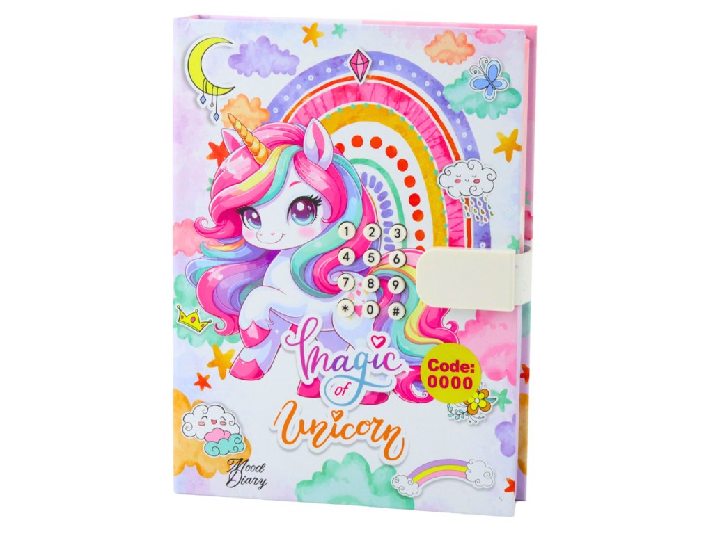 Tento očarujúci denník s kódom s motívom jednorožca je jedinečným darčekom pre deti, ktoré si chcú zaznamenať svoje myšlienky, tajomstvá a spomienky bezpečným a kreatívnym spôsobom. Diár je vybavený kombinovaným zámkom, ktorý chráni obsah pred neoprávneným prístupom a dáva dieťaťu pocit súkromia. Keď sa diár otvorí pomocou kódu na obale, zahrá sa veselá melódia, čo robí používanie zošita ešte príjemnejším.