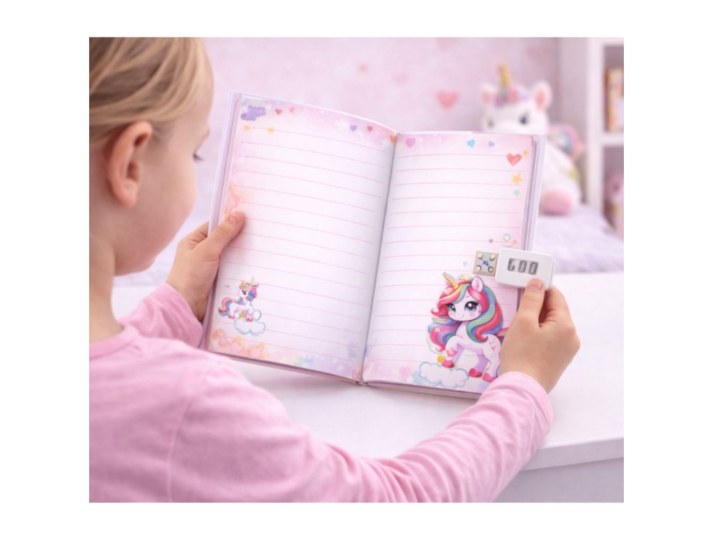 Kód na otvorenie je možné neskôr zmeniť, čo dieťaťu umožňuje prispôsobiť bezpečnosť svojim vlastným potrebám. Vnútro denníka je vyplnené farebnými stránkami zdobenými krásnymi motívmi, ktoré podnecujú k písaniu, kresleniu a kreatívnemu vyjadrovaniu emócií. Estetický dizajn a rozprávková grafika s jednorožcom rýchlo urobia z denníka obľúbeného spoločníka vášho dieťaťa.