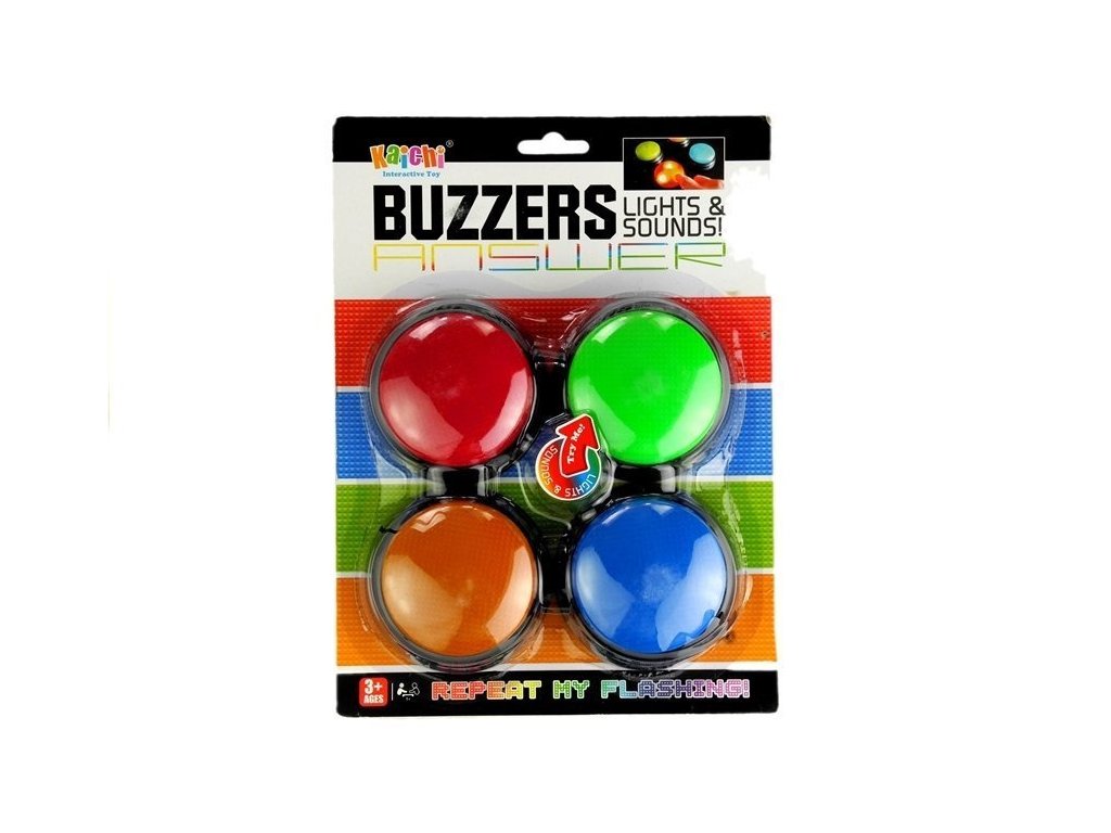 Sada bzučiakov je balená v blistrovom obale. Sada obsahuje štyri okrúhle disky, ktoré sú napájané dvoma 1,5 V AA batériami. Po vložení batérií do svetiel je hračka pripravená na hranie.