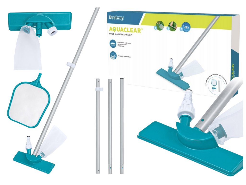 Ak máte v záhrade bazén, určite viete, čo to obnáša. Počas používania sa v ňom postupom času začínajú objavovať rôzne nečistoty a nepríjemné usadeniny. Každý majiteľ záhradného bazéna by mal mať medzi svojimi príslušenstvami na bazén aj súpravu na odstraňovanie nečistôt. S ňou bude voda vo vašom bazéne vždy čistá. Tyč je kompatibilná s vysávačom aj sieťkou. Po pripojení k vysávaču záhradná hadica nasaje nečistoty a vtiahne ich do vrecka. Vďaka sieťke, ktorá je súčasťou sady, budete môcť ľahko odstrániť všetky nečistoty z povrchu.