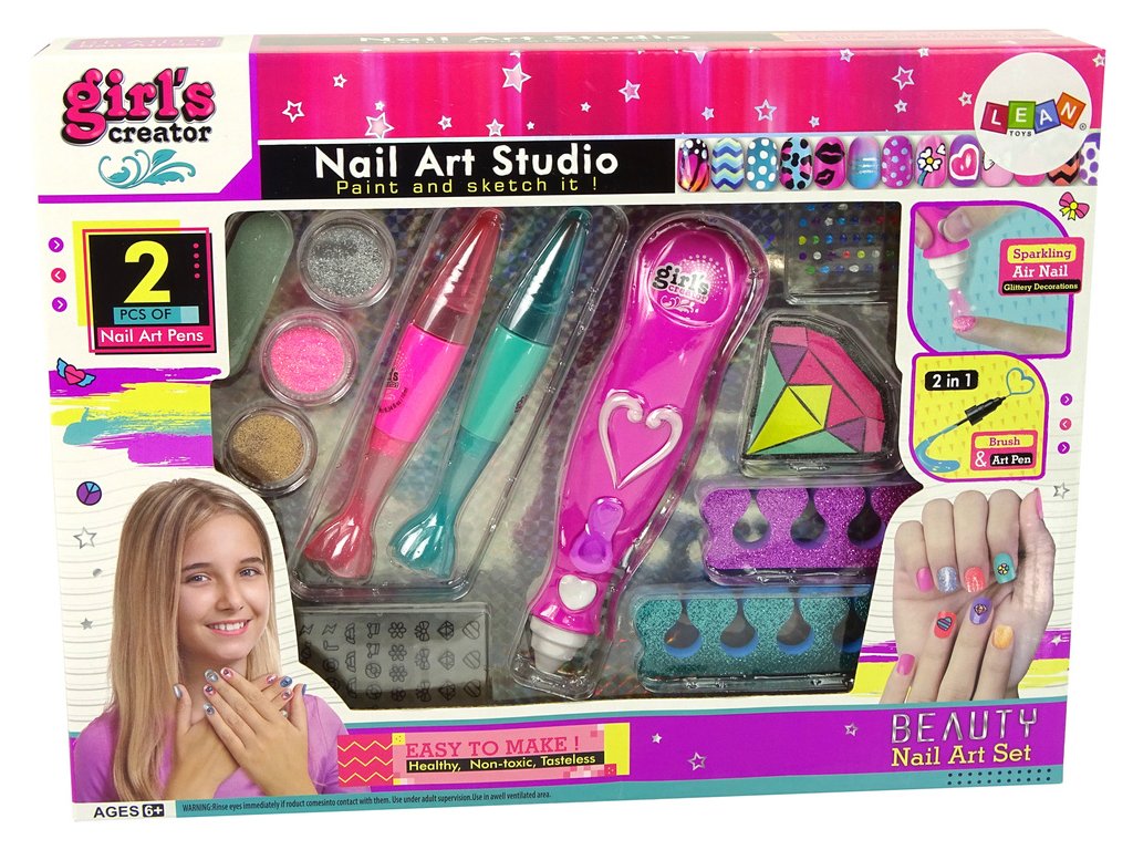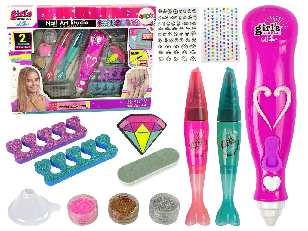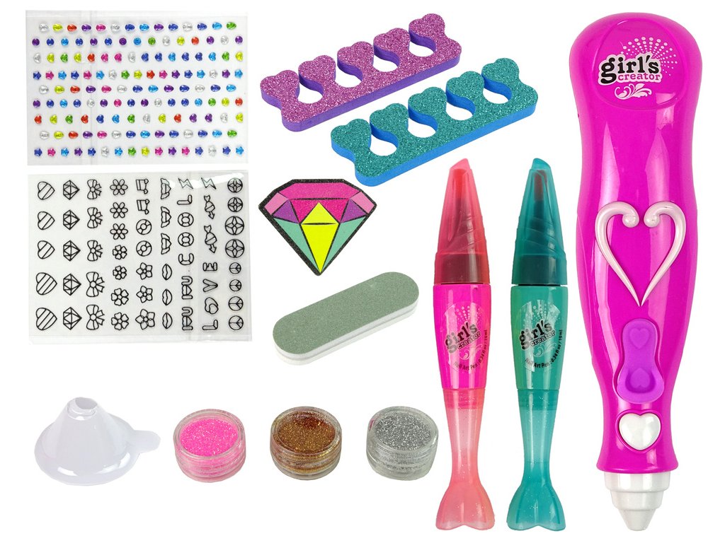 Po vyrovnaní dĺžky a tvaru nechtov diamantovým pilníkom naneste na nechty zvolenú farbu. Pero umožňuje presné maľovanie vzorov a je k dispozícii v dvoch farbách. Maľovaním vzorov si dievčatko rozvíja presnosť a vytvára si vlastný štýl. Nálepky a diamanty dodávajú originalitu a lesk. Jej kamarátky v škole alebo škôlke ju určite budú obdivovať.