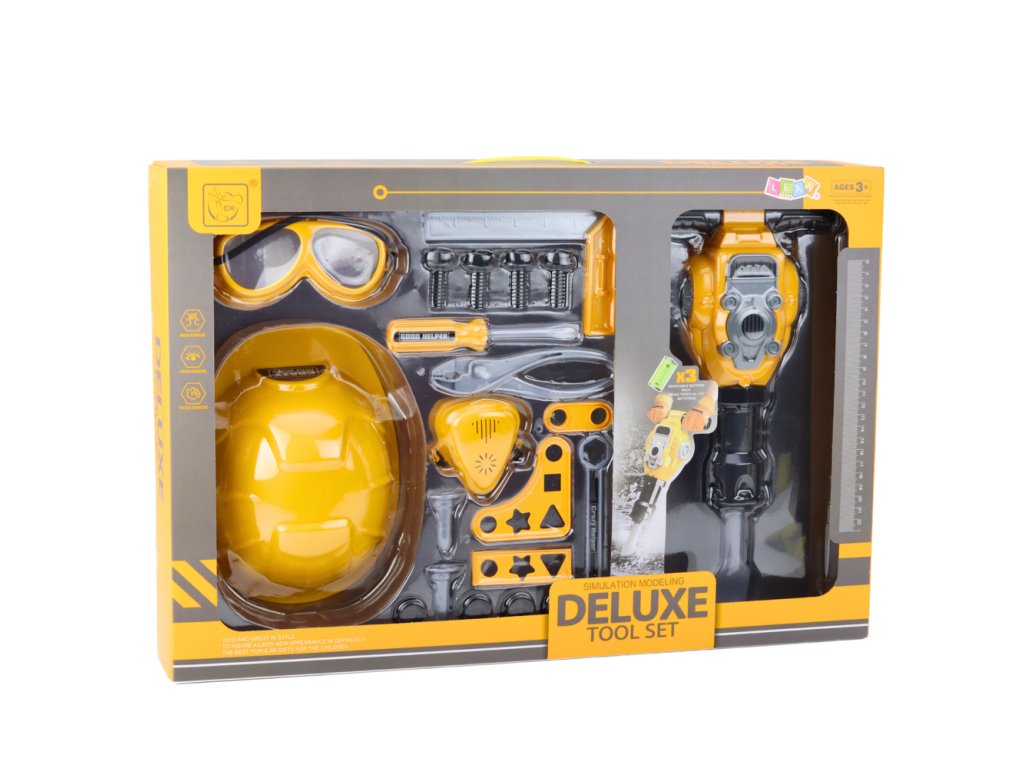 Súprava Deluxe Tool Set je kompletná, realistická a mimoriadne atraktívna hračka pre deti, ktoré s nadšením pozorujú svet dospelých a snívajú o vlastnej dielni. Súprava je určená pre malých nadšencov kutilstva a pozostáva z 21 dielov, ktoré deťom umožňujú hrať sa na staviteľa alebo inžiniera. Súprava obsahuje okrem iného interaktívne pneumatické kladivo na batérie, ochrannú prilbu, okuliare, masku, ako aj skrutkovače, kľúč, uholník, spojovacie prvky, skrutky a matice – všetko, čo je potrebné na bezpečnú a kreatívnu hru so stavbou.