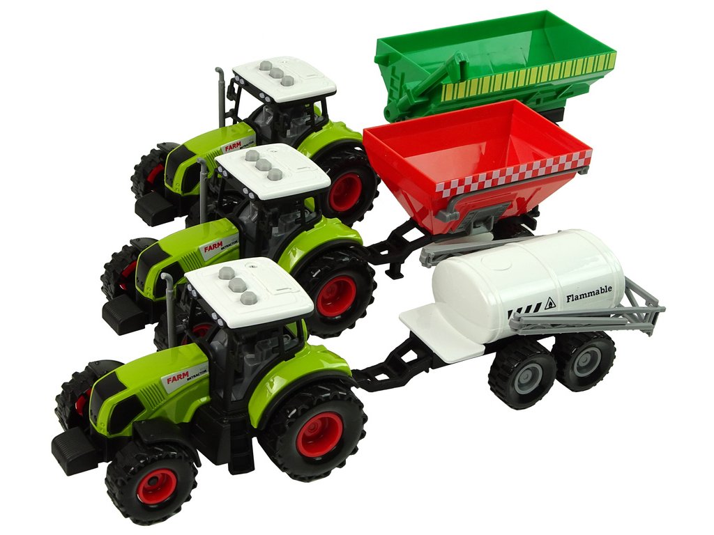 Sada troch traktorov, prívesov, postrekovačov, poľnohospodársky traktor
