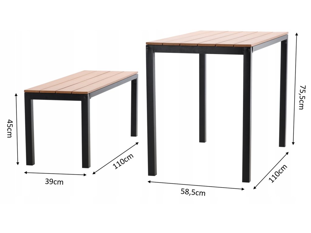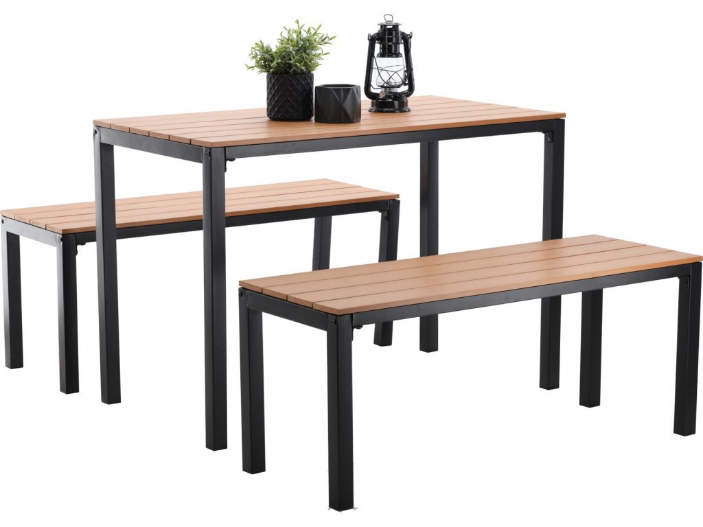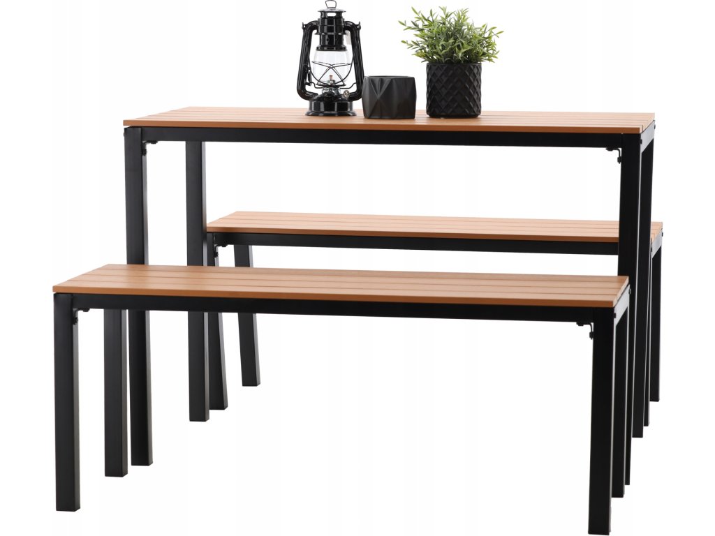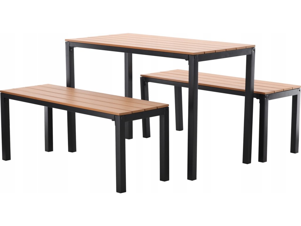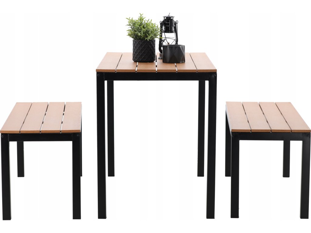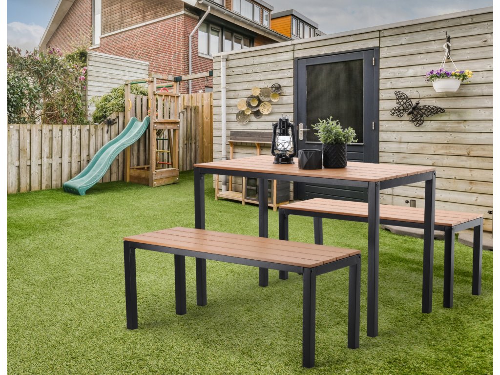 Konštrukcia je vyrobená z práškovo lakovanej ocele, ktorá zabezpečuje vysokú odolnosť voči korózii, vlhkosti a poveternostným podmienkam. Sedacie časti a doska stola sú z plastových lamiel s imitáciou dreva, ktoré spájajú prirodzený vzhľad s nenáročnou údržbou. Nábytok si tak zachová svoj vzhľad počas viacerých sezón bez nutnosti špeciálneho ošetrovania.
