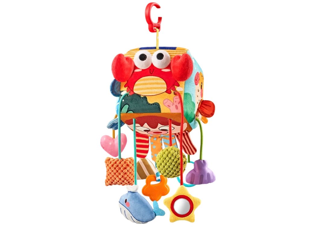 Tento farebný senzorický kockový prívesok je ideálny pre malé deti od prvých mesiacov života. Hračka bola navrhnutá tak, aby podporovala zmyslový vývoj vášho dieťaťa a poskytovala mu veľa zábavy a bezpečnú a vzdelávaciu hru. Motívy morských zvierat a rôznorodé textúry stimulujú fantáziu a zmysly vášho dieťaťa.