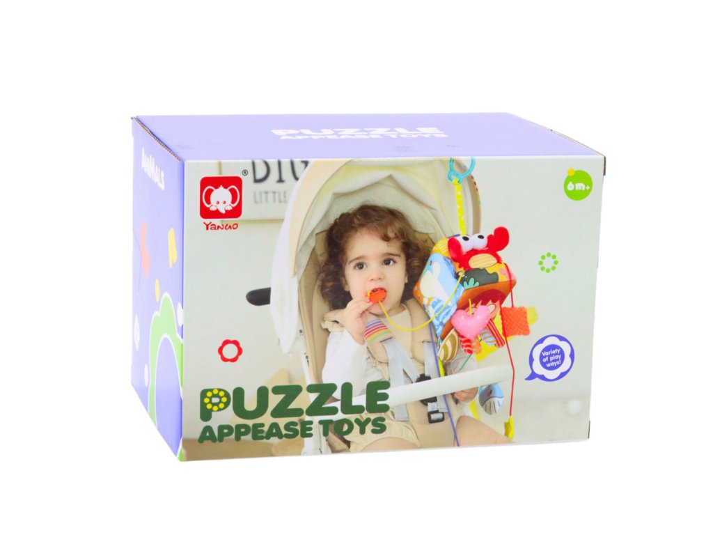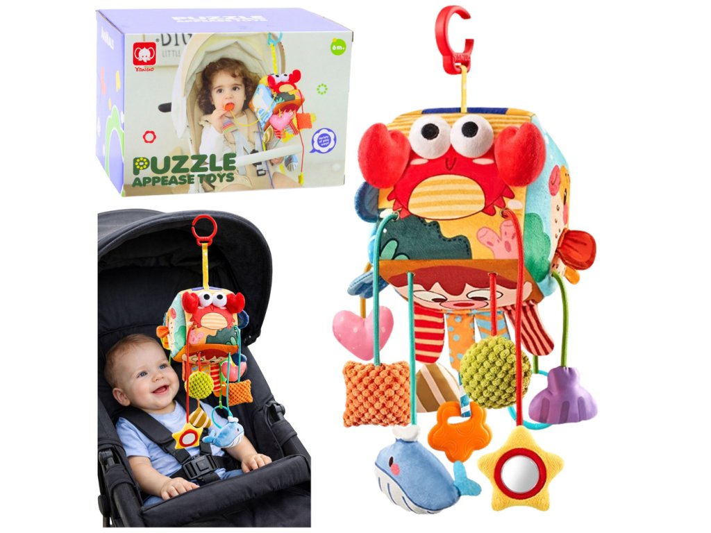 Prívesky pripevnené k kocku majú rôzne funkcie – každý má inú senzorickú štruktúru, niektoré šuštia, iné hrkocú a ďalšie sa dajú ťahať a stláčať. Všetky prvky povzbudzujú dieťa k interakcii a samostatnému objavovaniu.