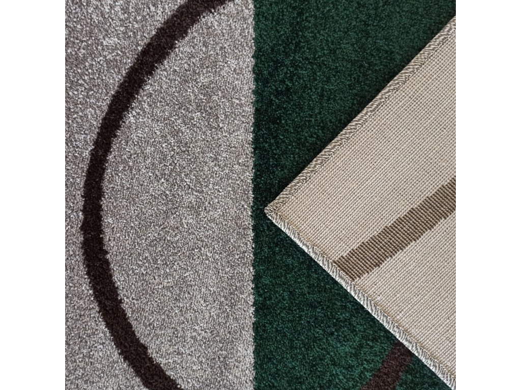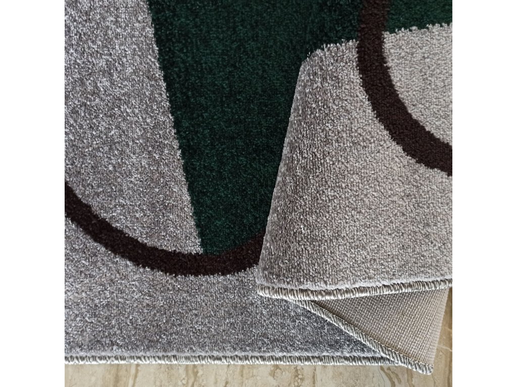 Kolekcia kobercov Otto sa vyznačuje pútavými a modernými vzormi, ktoré oživujú interiér. Tento konkrétny model kombinuje základnú sivú farbu s prvkami fľaškovo zelenej a čiernymi líniami, ktoré vytvárajú abstraktné tvary.