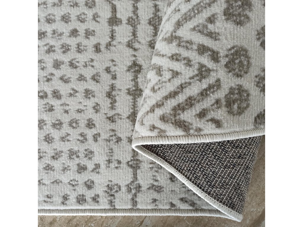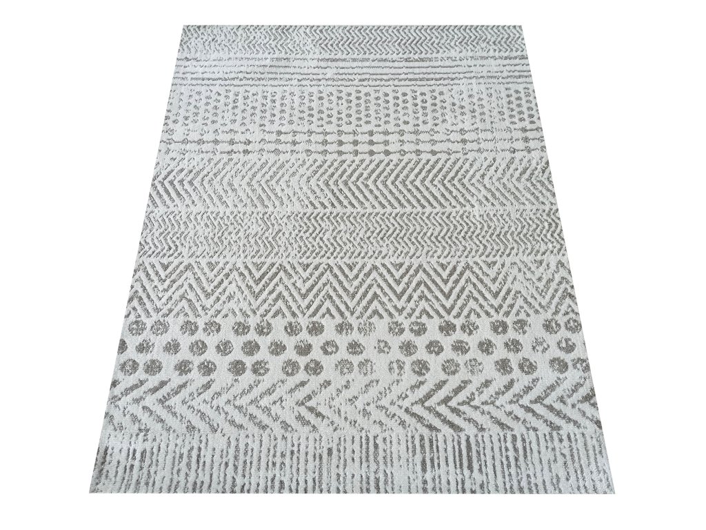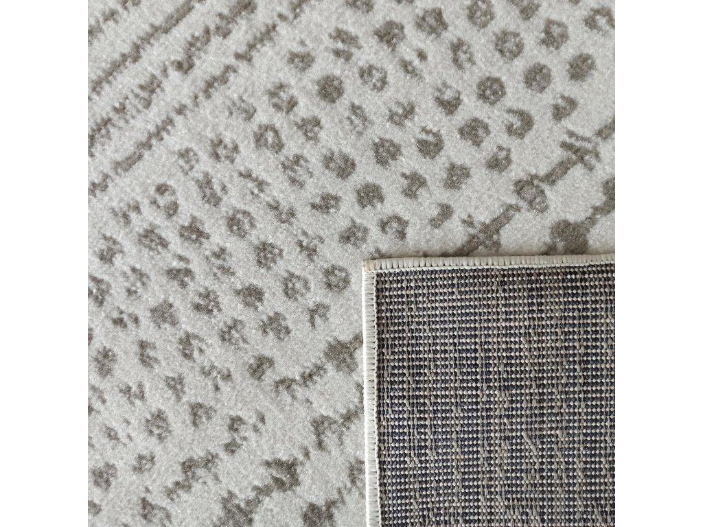 Tento moderný kusový koberec z kolekcie Lara sa vyznačuje sofistikovaným geometrickým vzorom, ktorý je skutočnou ozdobou miestnosti. Dizajn v neutrálnych odtieňoch sivej a bielej farby sa ľahko kombinuje s akýmkoľvek nábytkom a dodáva interiéru štýlový a minimalistický charakter. Vzor inšpirovaný chevronmi a bodkami nevychádza z módy a vytvára zaujímavý vizuálny efekt.