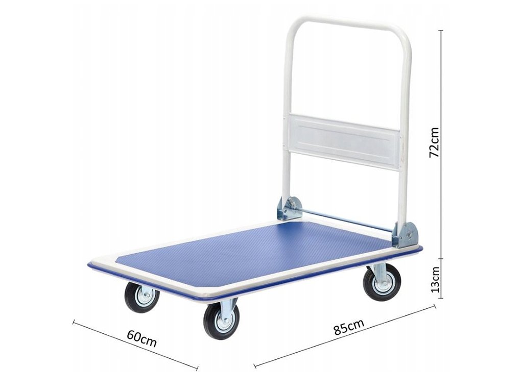 Vozík disponuje rozmermi 85 × 60 × 85 cm, čo poskytuje dostatočne veľkú prepravnú plochu pre krabice, balíky, materiál či náradie. Pevný kovový rám zabezpečuje stabilitu aj pri maximálnom zaťažení a je navrhnutý na dlhodobé intenzívne používanie.