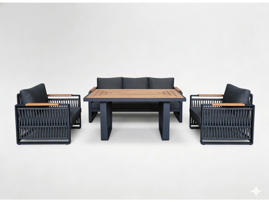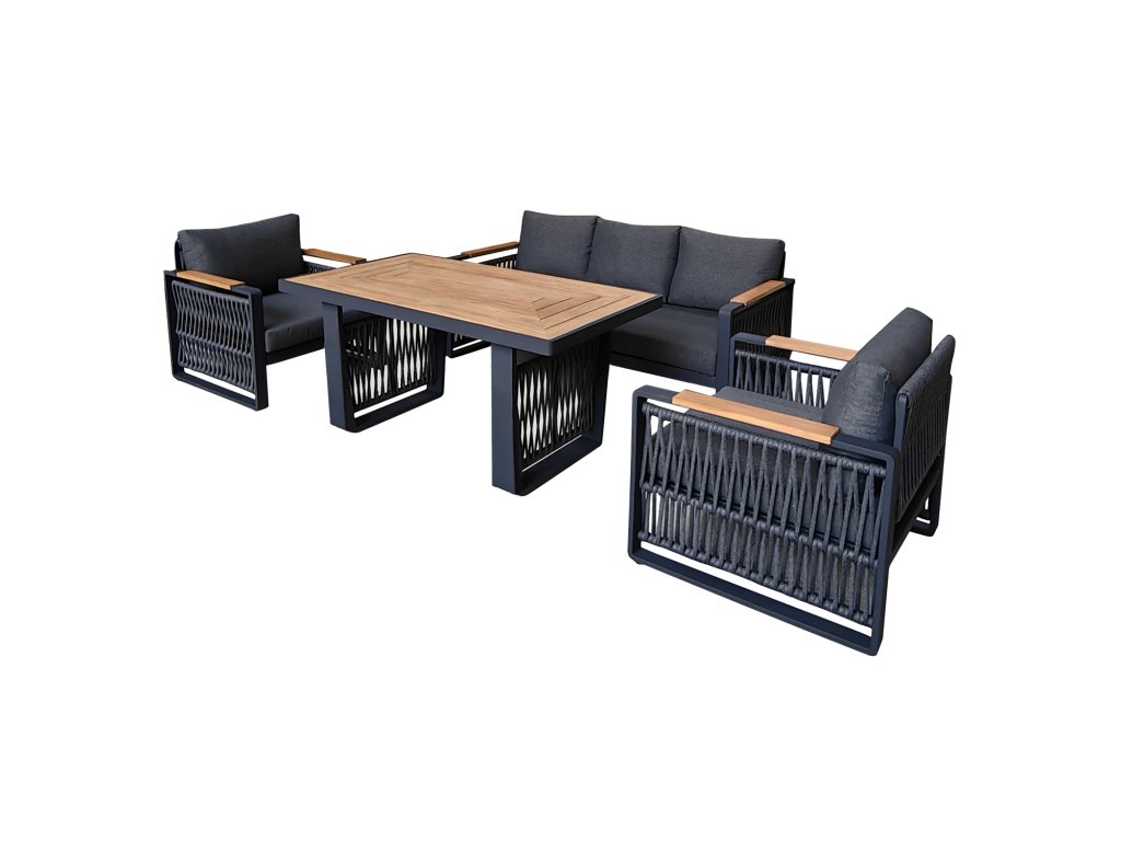 Elegantná záhradná súprava s hliníkovým rámom, rohovou pohovkou, lavicou a stolom. Béžové vankúše zaručujú vysoký komfort, zatiaľ čo doska stola a podrúčky z DPC mu dodávajú...