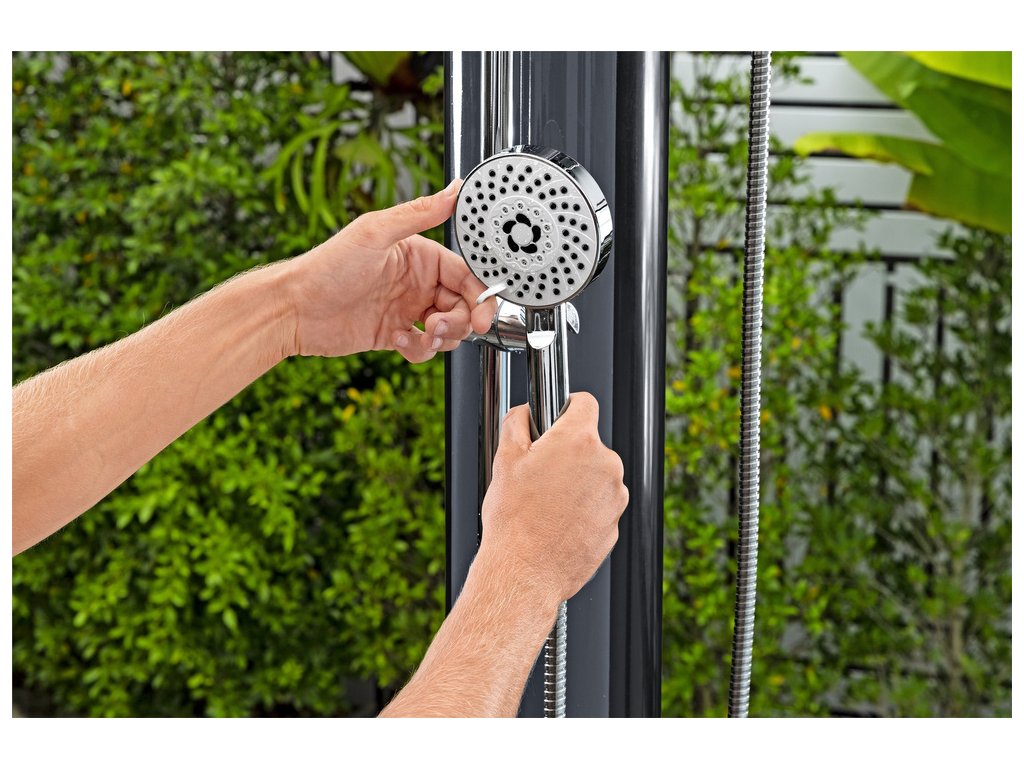 Záhradná sprcha je ideálnym riešením pre každého, kto sa chce osprchovať pred skokom do bazéna, ale to nie je všetko. Je tiež ideálna na ochladenie v horúcich dňoch alebo na relaxáciu po fyzickej námahe. Vďaka nastavovacej rukoväti si môžete zvoliť správnu teplotu vody. Nastaviteľná sprchová hlavica môže byť trvalo namontovaná alebo držaná v ruke a má viacero nastavení striekania. Ľahko sa inštaluje vďaka priloženej základni alebo sa dá namontovať na akýkoľvek povrch. Všetky potrebné montážne prvky sú súčasťou sady. Pevná základňa zaisťuje stabilitu. Sprcha je vyrobená z odolného materiálu, ktorý zaručuje dlhú životnosť produktu a odolnosť voči poveternostným podmienkam.