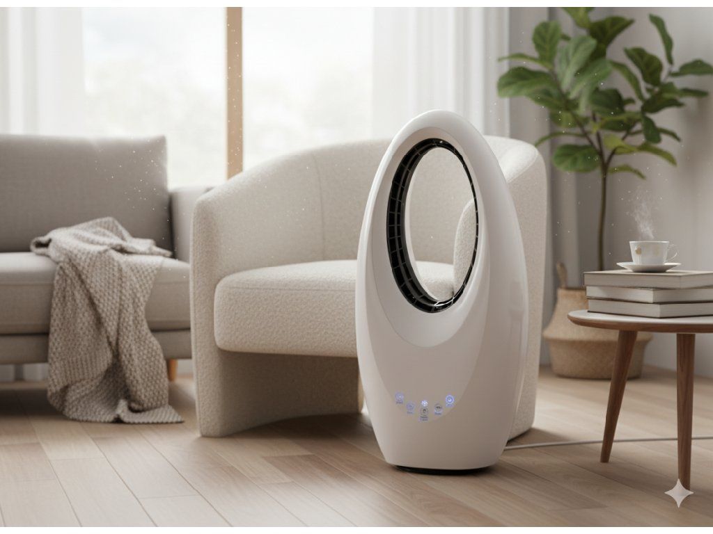 Moderný stojací ventilátor bez lopatiek je ideálnym riešením pre domácnosť, kanceláriu aj spálňu. Zaisťuje rovnomerný a pokojný prúd vzduchu, ktorý účinne chladí bez nepríjemných poryvov.