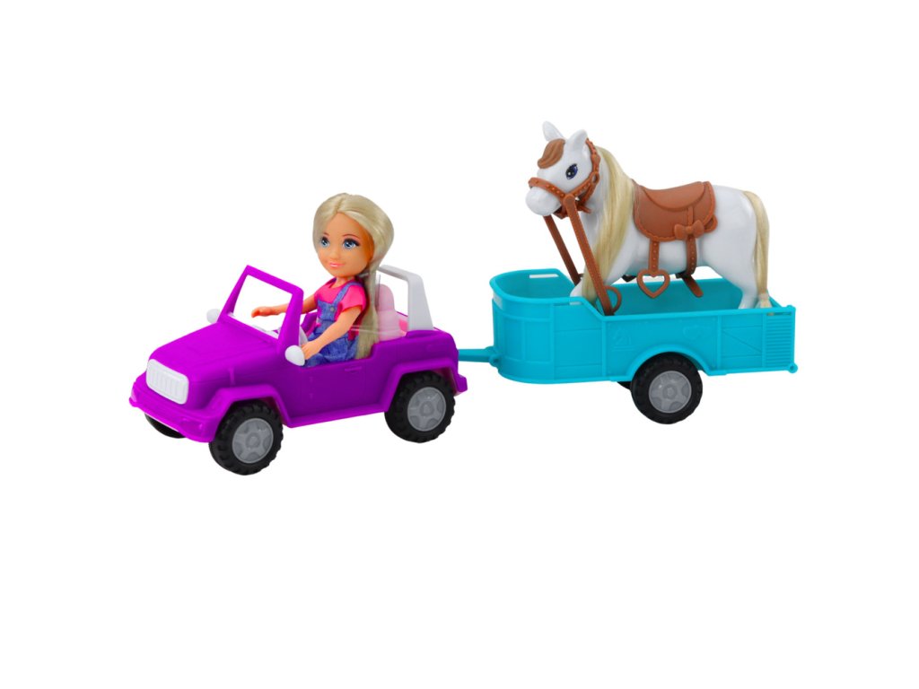 - Súprava obsahuje: auto, príves, bábiku, koňa so sedlom