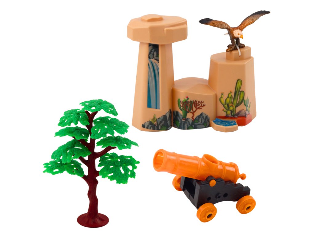 Každý prvok sady je vyrobený z pevného, odolného plastu, ktorý vydrží intenzívne používanie. Vďaka tomu je hračka ideálna nielen na hranie doma, ale aj vonku – na záhrade, v pieskovisku alebo na terase. Prítomnosť lode s veslami, pohyblivého dela, rozložitých stromov, skalných útvarov a divokých zvierat, ako sú vlk, had a orol, umožňuje deťom vytvárať nespočetné množstvo scenárov – od duelov po napínavé dobrodružstvá a prepadnutia.