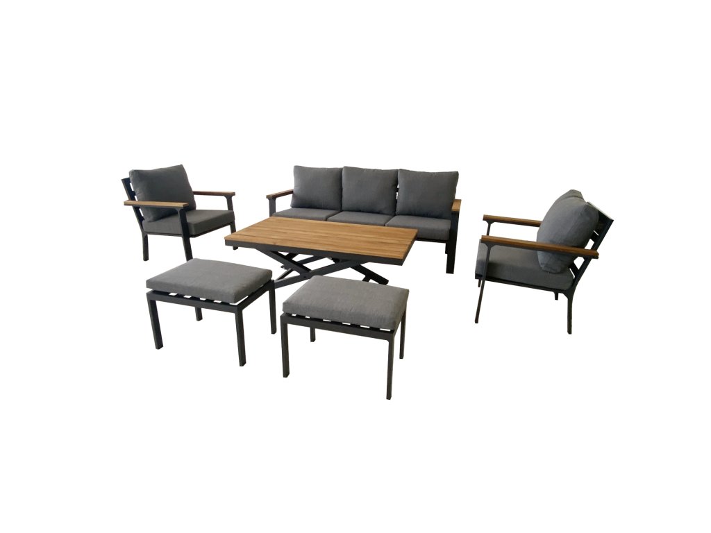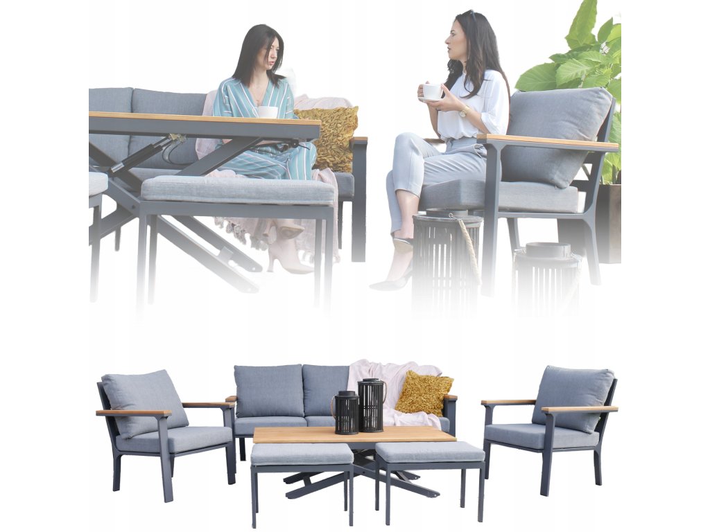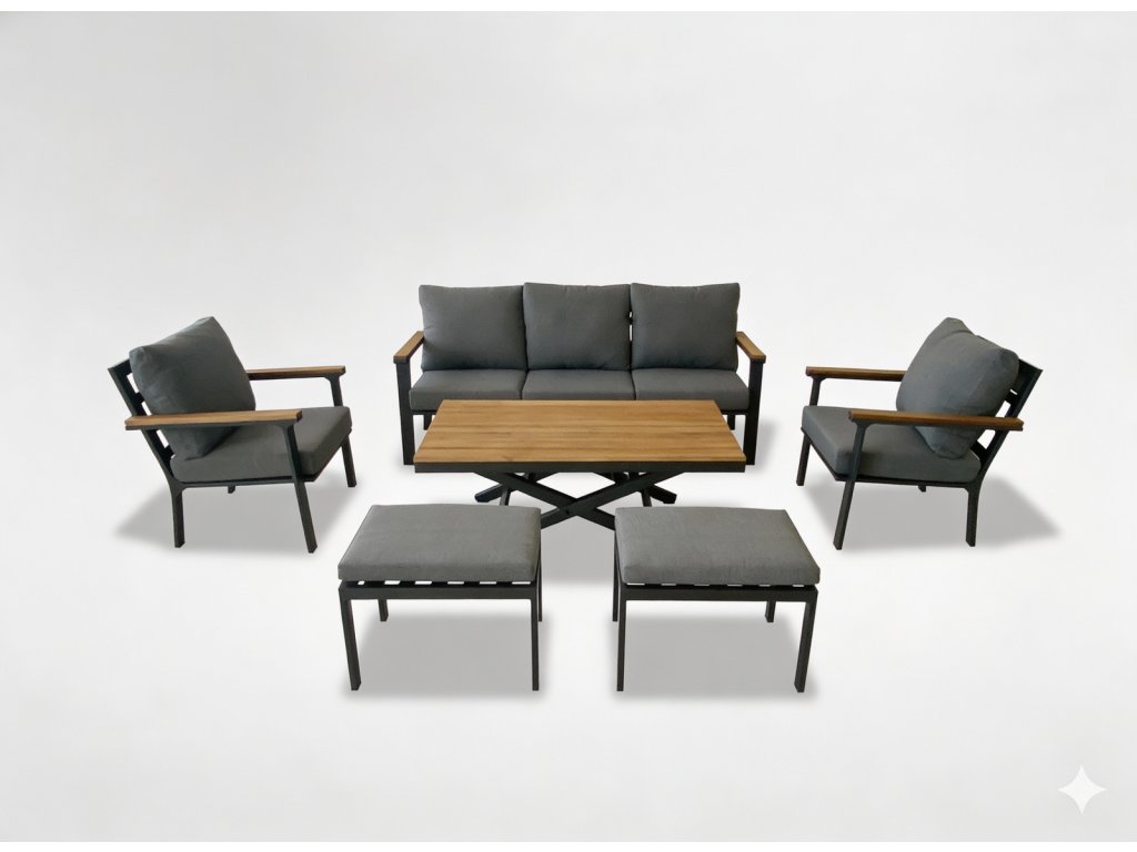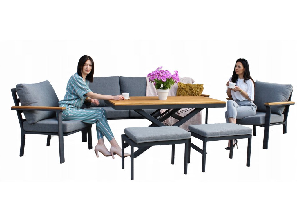 Set obsahuje trojmiestnu pohovku (194 × 75 × 81 cm, max. 330 kg), dve kreslá (74 × 75 × 81 cm, max. 110 kg každé), dve taburetky (60 × 40 × 45 cm, max. 110 kg každá) a výškovo nastaviteľný stôl (140 × 71,5 × 46–69 cm, max. 50 kg). Hliníkový rám je ľahký, stabilný a odolný proti korózii, zatiaľ čo prvky z teakového dreva a WPC dosky dodávajú setu prirodzený vzhľad a odolnosť voči poveternostným vplyvom bez nutnosti údržby. Olefínové vankúše sú mäkké, pohodlné, ľahko sa čistia a odolávajú vyblednutiu. Nastaviteľný stôl umožňuje prispôsobenie výšky pre stolovanie či relaxáciu, pričom kompaktné usporiadanie sa hodí aj do menších priestorov.