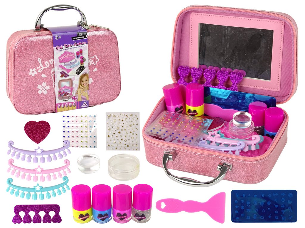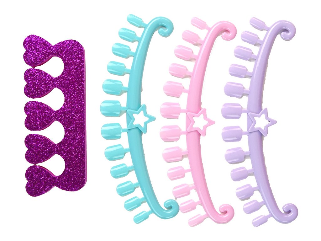 Vo vnútri sa nachádza bohatá sada príslušenstva na kreatívne hranie a experimentovanie s vzhľadom. Deti v nej nájdu 4 rôznofarebné laky na nechty, kozmetický separátor, pilník, doštičku so vzormi, špachtľu, 3 šablóny na tipy a nálepky, pečiatku, nádobku, nálepky a kryštály.