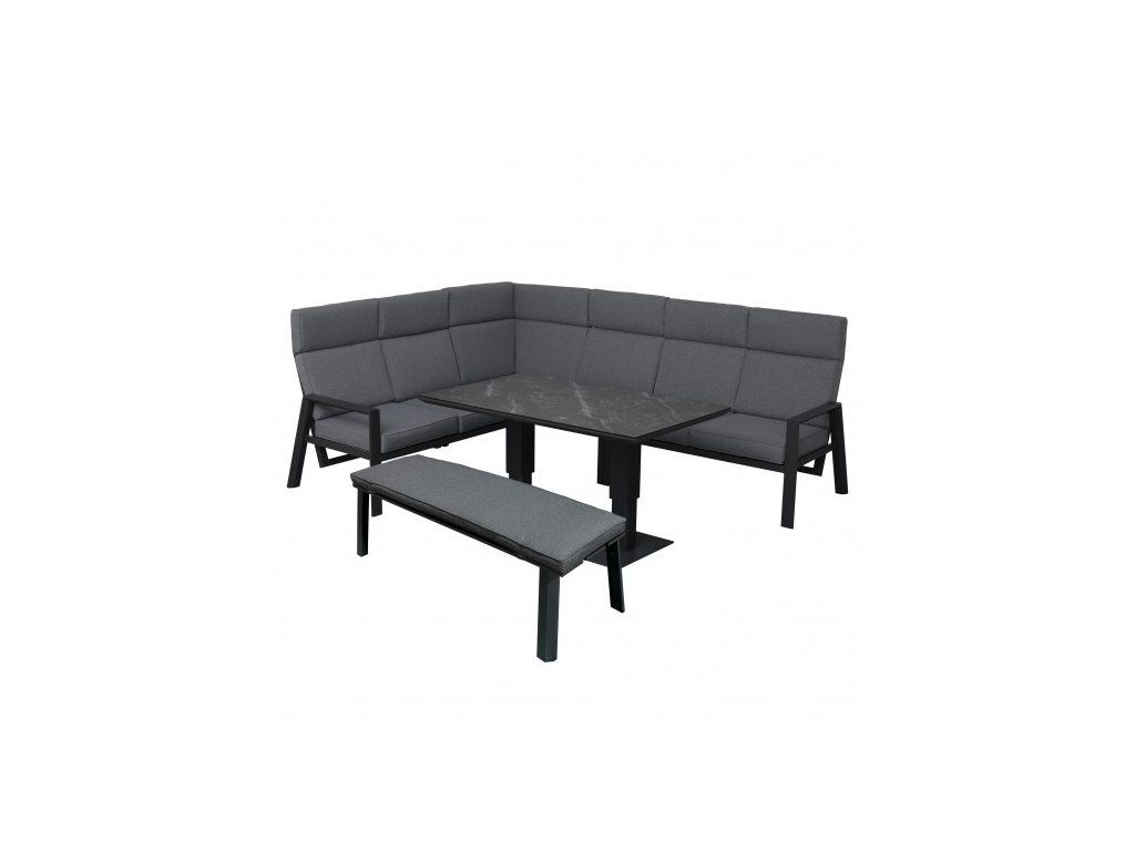 Sada nábytku s rohovou časťou je vynikajúcou voľbou pre tých, ktorí hľadajú spojenie elegancie, funkčnosti a moderného dizajnu. Rám nábytku je vyrobený z ľahkého, ale mimoriadne odolného hliníka. Čalúnenie je vyrobené z polyesterovo-bavlnenej tkaniny. Zdvíhací stôl s doskou z keramického skla je praktickým riešením, ktoré dodáva súprave elegantný charakter. Takýto stôl je vynikajúcim miestom na stolovanie pod šírym nebom, ale zároveň dodáva štýl celému zariadeniu. Táto moderná súprava nábytku s rohovým dielom je štýlovým dekoratívnym prvkom, ktorý podčiarkne charakter každého vonkajšieho priestoru.