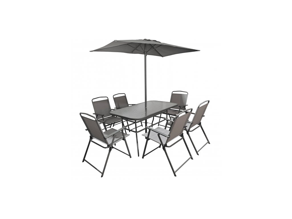 - Zloženie sady: 1 × stôl, 6 × skladacieľné stoličky, 1 × slnečník