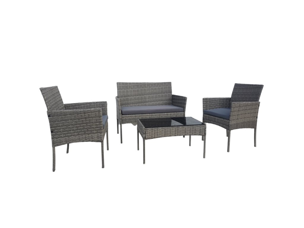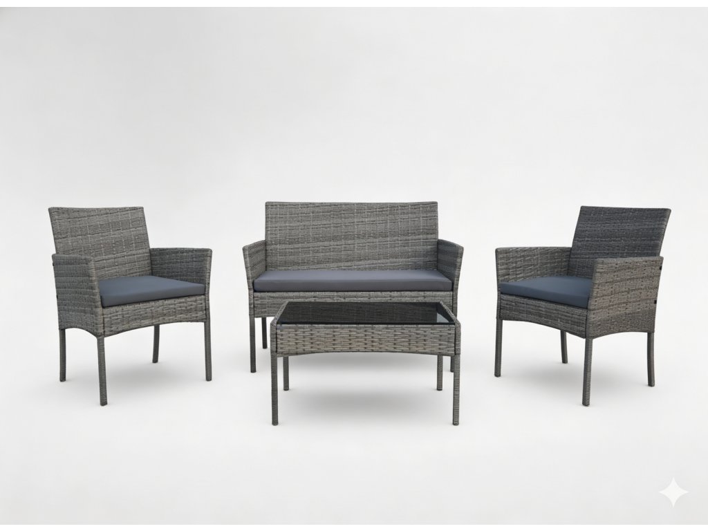 Vytvorte si príjemné miesto na oddych s modernou súpravou ratanového nábytku v šedej farbe, ktorá kombinuje čistý dizajn a praktické využitie. Elegantné sivé prevedenie pôsobí nadčasovo a ľahko sa kombinuje s akýmkoľvek exteriérom – od minimalistickej terasy až po útulný balkón. Set tvorí pohovka a dve kreslá s mäkkými vankúšmi pre maximálne pohodlie a elegantný stolík s tvrdeným sklom.