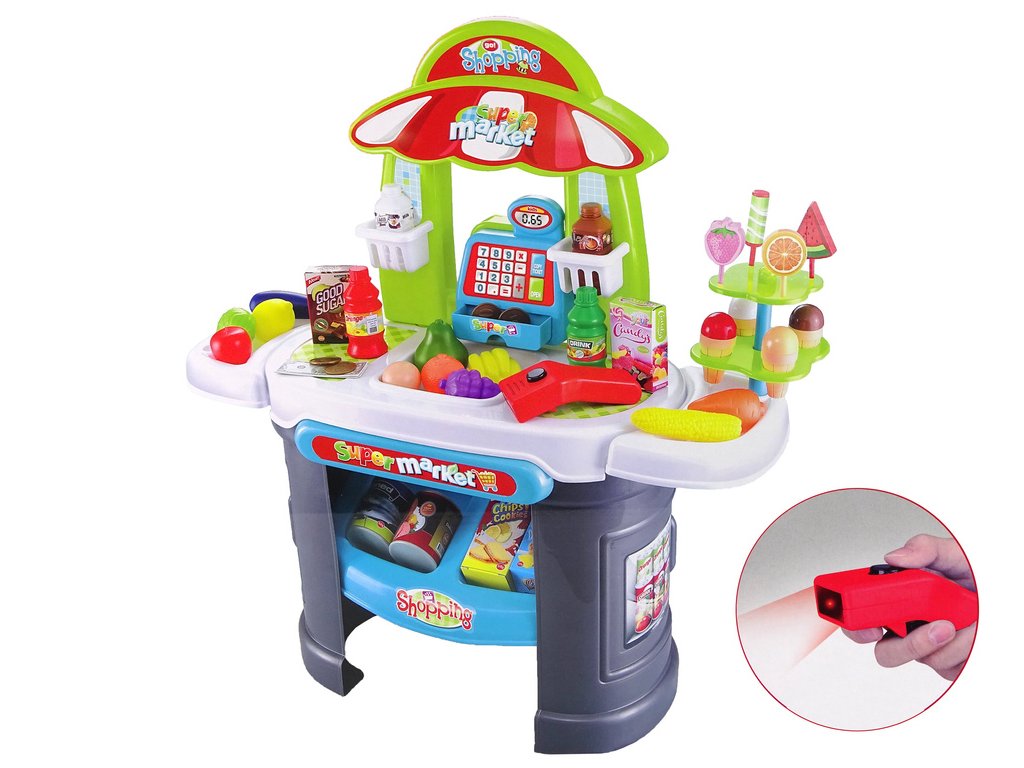 Táto viacdielna sada doplní každú detskú izbu a poskytne hodiny zábavy. Celý supermarket má skrine a police na potravinárske výrobky. Pri nakupovaní ich naskenujeme skenerom, počujeme pípnutie a uvidíme červené svetlo. Supermarket môže perfektne spestriť každú detskú hru.