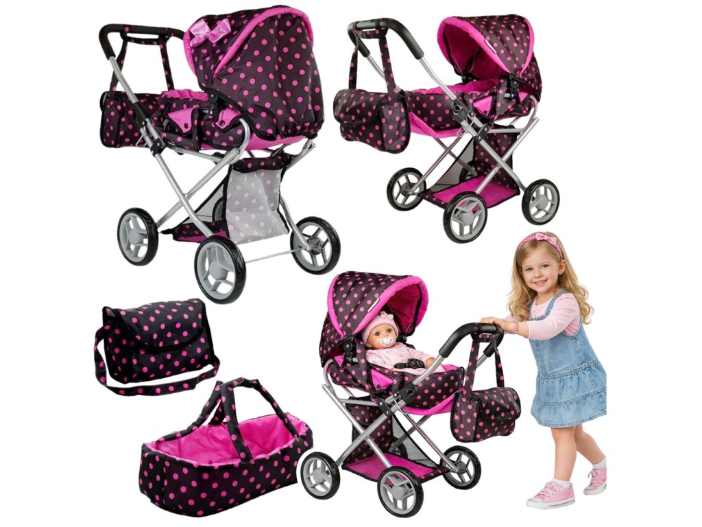 Kočík má tlmenú farbu, ktorá dieťa nerozptyľuje. Látka kočíka je čierna s ružovými bodkami. Na boku kapucne je krásna ružová mašľa. Kočík má mnoho ďalších výhod. Nielenže sa bábika môže prepravovať v ľahu, ale vanička sa dá zložiť do kočíka, aby bábika nevypadla, a navyše je vybavená sivými popruhmi. Kapucňu je možné sklopiť. Potrebné príslušenstvo pre bábiku je možné uložiť do priloženej tašky. Sada obsahuje aj detský nosič a na spodnej strane kočíka je košík na najpotrebnejšie veci.