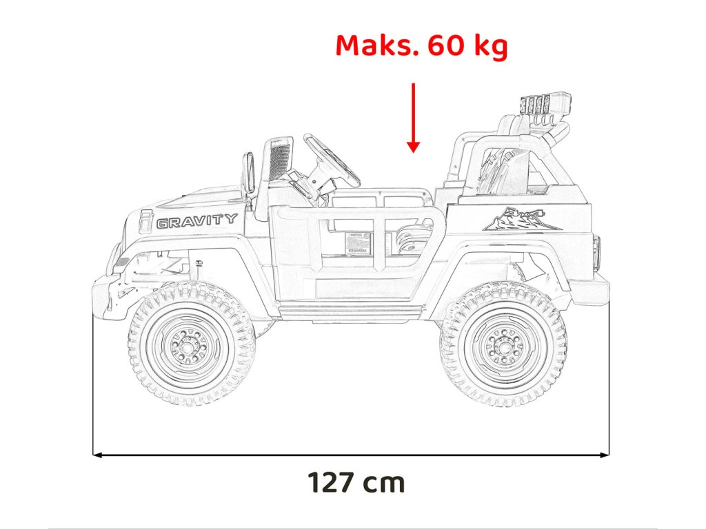 - Rozmery vozidla: Dĺžka 127 cm, Šírka 76 cm, Výška 75 cm,
