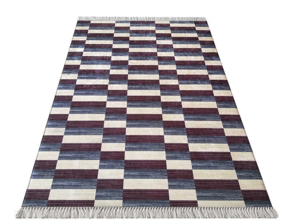 Tmavomodrý koberec s geometrickým vzorom Blanka 01 prináša do interiéru moderný a svieži vzhľad. Kombinácia tmavomodrých, fialových a bielych odtieňov v štýlovom šachovnicovom vzore vytvára dynamický vizuálny efekt, ktorý oživí každý priestor.