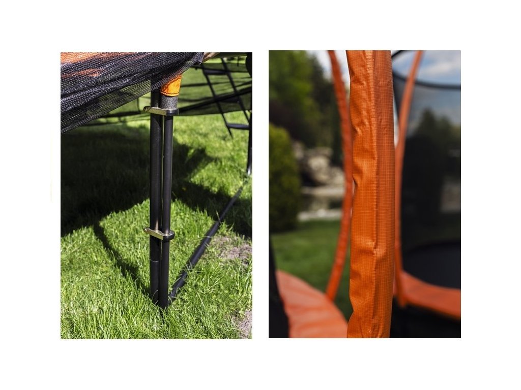 Robustný rám z pozinkovanej ocele je odolný voči korózii a nepriaznivým poveternostným podmienkam. Stabilitu zabezpečujú pevné nohy v tvare „U“, ktoré udržia trampolínu stabilnú aj pri intenzívnom skákaní. Skákacia plocha z kvalitného PP materiálu je UV-odolná a spolu s pevnými pružinami poskytuje plynulý a dynamický odraz.
