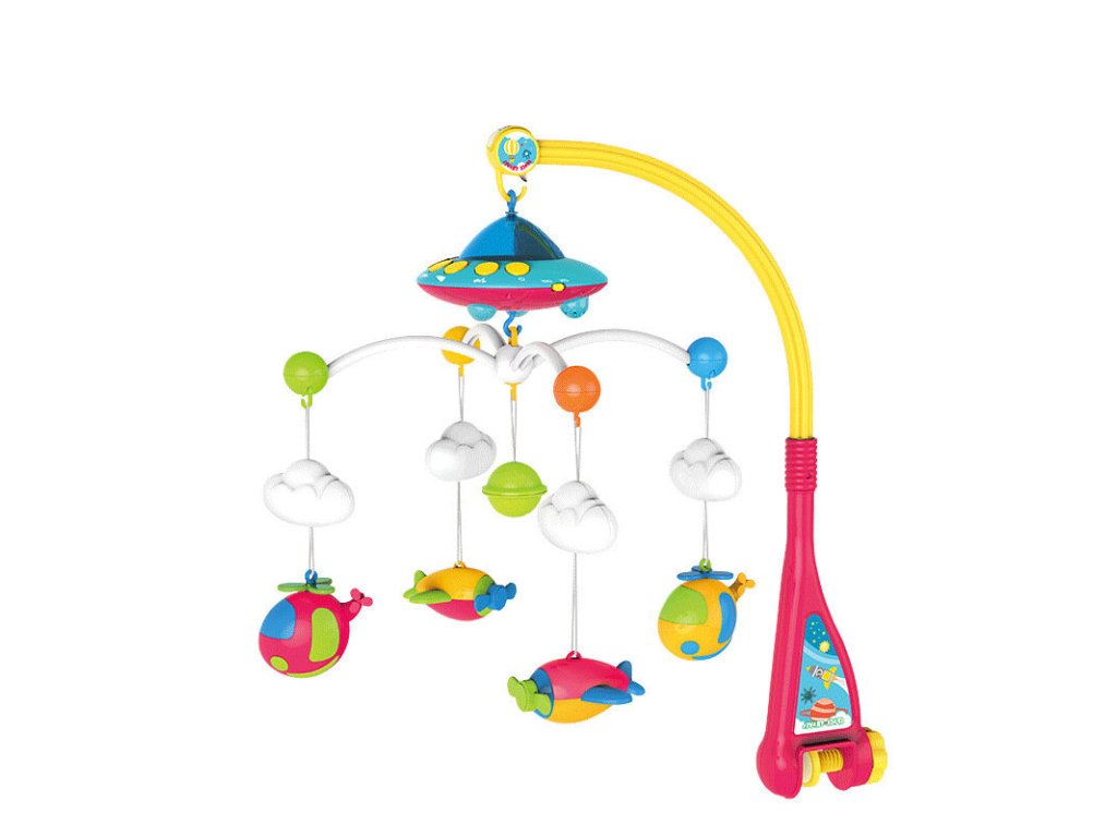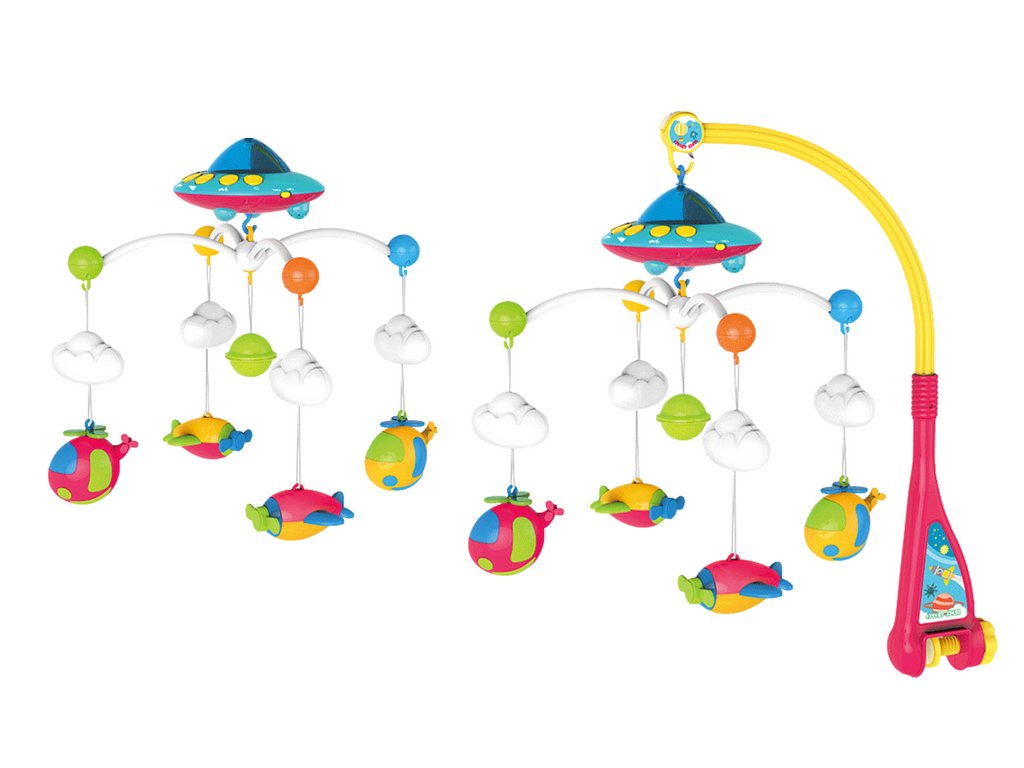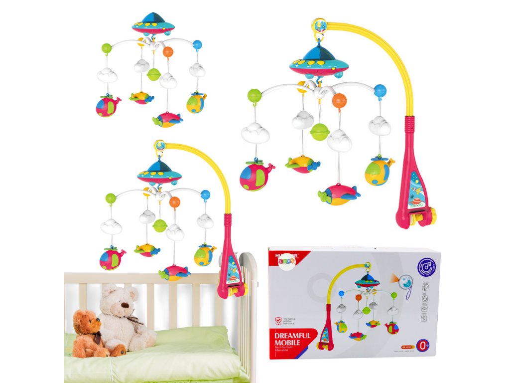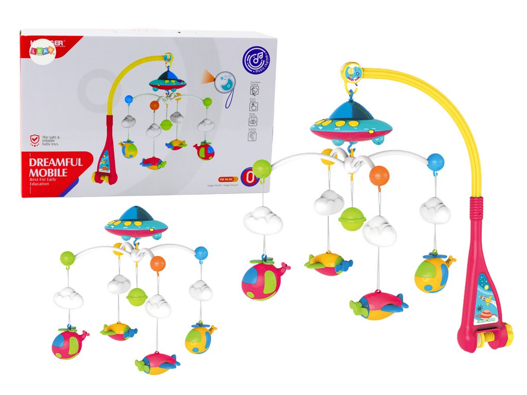Mobil má formu očarujúcej hudobnej skrinky v tvare UFO, čo mu dodáva moderný a atraktívny vzhľad, ktorý perfektne zapadá do detskej izby. Hračky v tvare lietadiel a vrtuľníkov sú zavesené na ramenách mobilu a jemne sa otáčajú v rytme hudby, čím stimulujú zmysly dieťaťa a podporujú pozorovanie. To pomáha vášmu dieťaťu rozvíjať motorické a vnemové schopnosti sledovaním pohybujúcich sa prvkov očami.