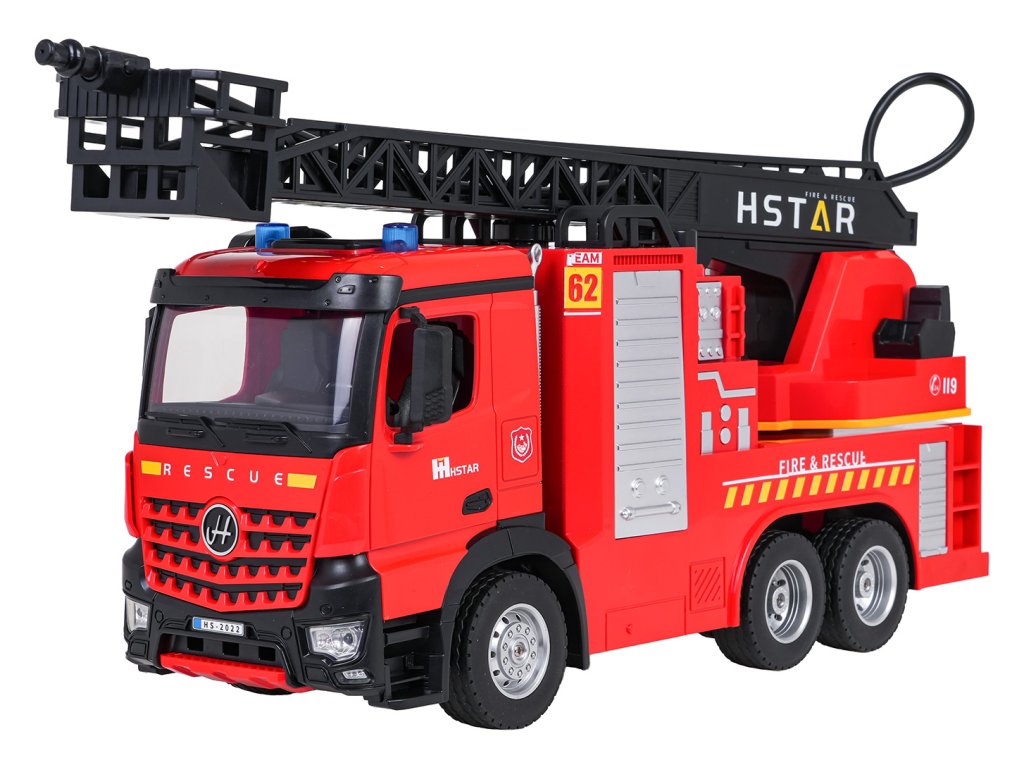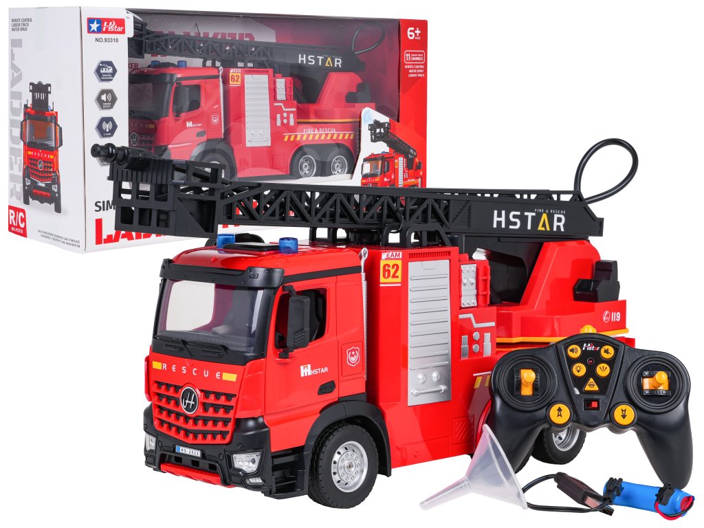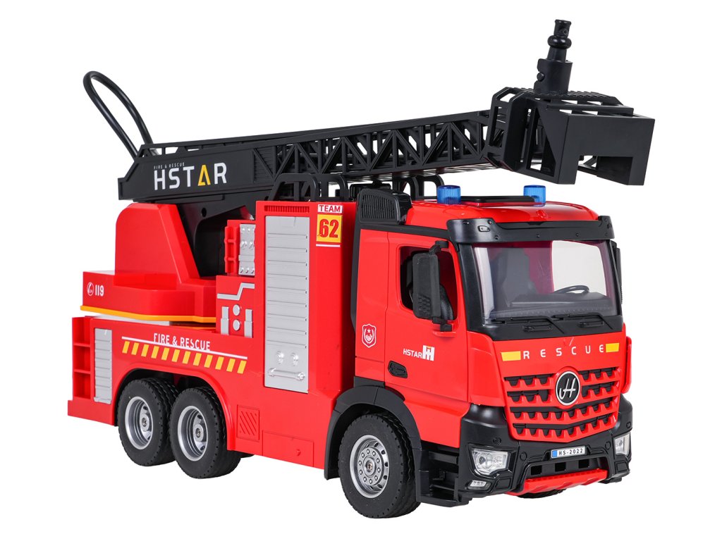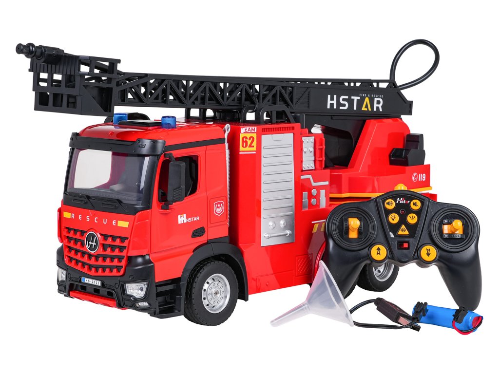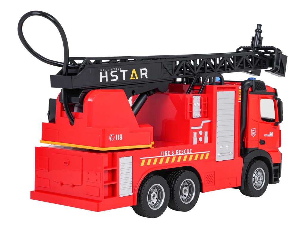 Diaľkovo ovládané hasičské auto s výsuvným rebríkom a funkciou vody pre deti od šiestich rokov. Vozidlo bolo vyrobené s dôrazom na detail z bezpečných materiálov najvyššej kvality. Jeho pevná a odolná konštrukcia zaručuje dlhú životnosť. Diaľkové ovládanie umožňuje pohybovať vozidlom vo všetkých smeroch, ovládať rebrík hore a dole a otáčať ho. Nezvyčajnou vlastnosťou vozidla je funkcia vody. Po naplnení nádrže vodou a stlačení tlačidla na diaľkovom ovládaní začne z hadice vychádzať vodná hmla. Vozidlo je vybavené zvukovými a svetelnými efektmi v podobe výstražných svetiel, predných svetlometov a realistických zvukov jazdy a cúvania. Vozidlo je napájané 3,7 V batériou (súčasť balenia) a diaľkové ovládanie vyžaduje 2 x AA 1,5 V batérie (nie sú súčasťou balenia).
