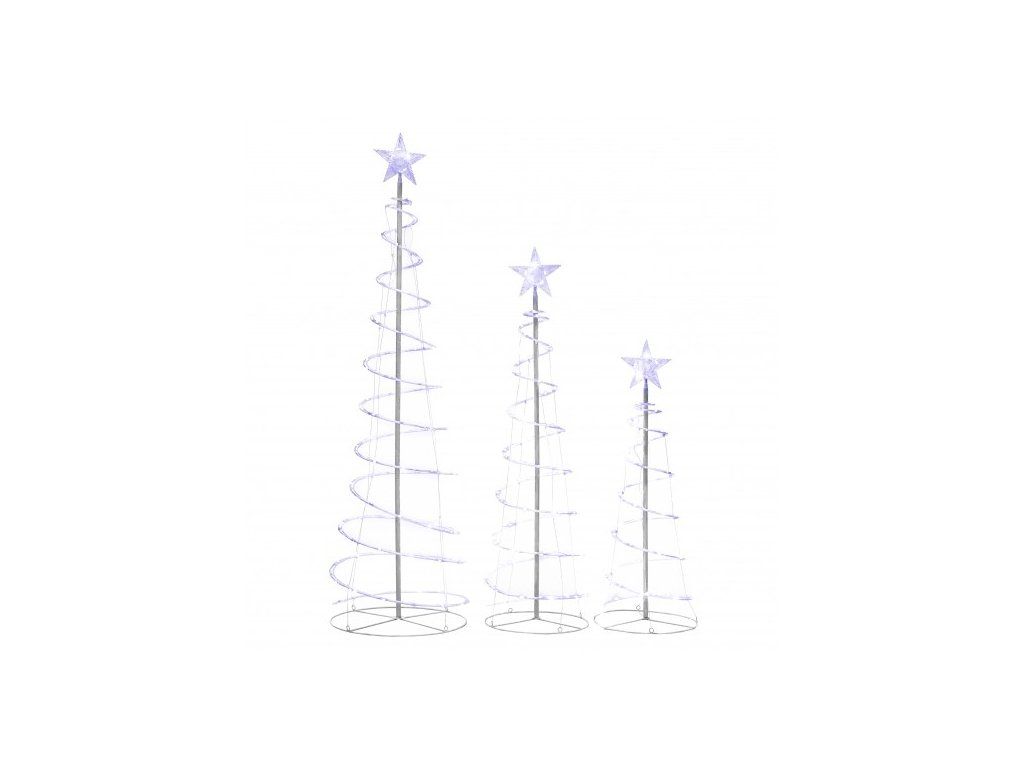 Moderný vonkajší vianočný stromček dodá vianočným dekoráciám lesk a jedinečný štýl. Biele LED svetlá krásne žiaria, vďaka čomu dekorácia terasy vyzerá veľmi efektívne. LED žiarovky prinášajú značnú úsporu energie, preto takéto vonkajšie osvetlenie nemusí byť vôbec nákladné. Súprava obsahuje 3 vianočné stromčeky rôznych rozmerov. Vďaka použitým materiálom a vhodnej konštrukcii sú spoľahlivé. Vianočné stromčeky možno použiť ako vonkajšiu aj vnútornú dekoráciu.