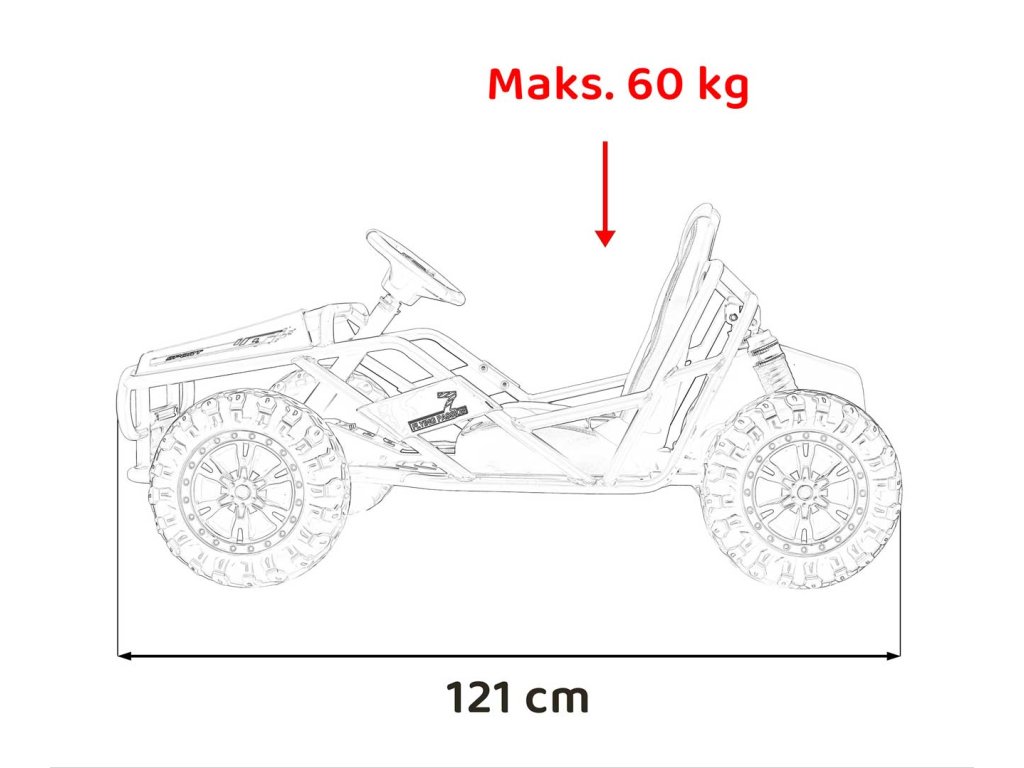 - Veľkosť vozidla: Dĺžka 121 cm, Šírka 76 cm, Výška 68 cm,