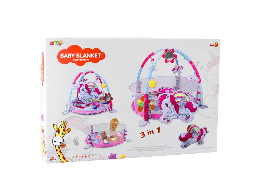 Vzdelávacia podložka 3 v 1 s jednorožcom je multifunkčný priestor na hranie a odpočinok, navrhnutý s ohľadom na najmenšie deti. Táto očarujúca, farebná podložka s motívom jednorožca kombinuje tri funkcie: klasickú vzdelávaciu podložku s tyčami a príveskami, suchý bazén s guličkami a mäkký priestor na kotúľanie sa a učenie sa samostatne sedieť.