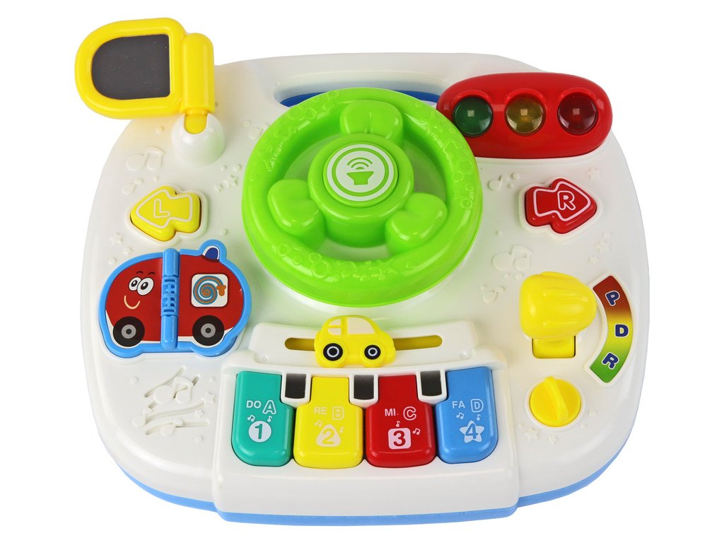 Stredobodom dosky je interaktívny volant s realistickým klaksónom, smerovkami, ktoré veselo blikajú v oboch smeroch, a semaformi, ktoré sa aktivujú. Nie je to len zábava, ale aj výučba dopravných pravidiel a motorickej koordinácie.