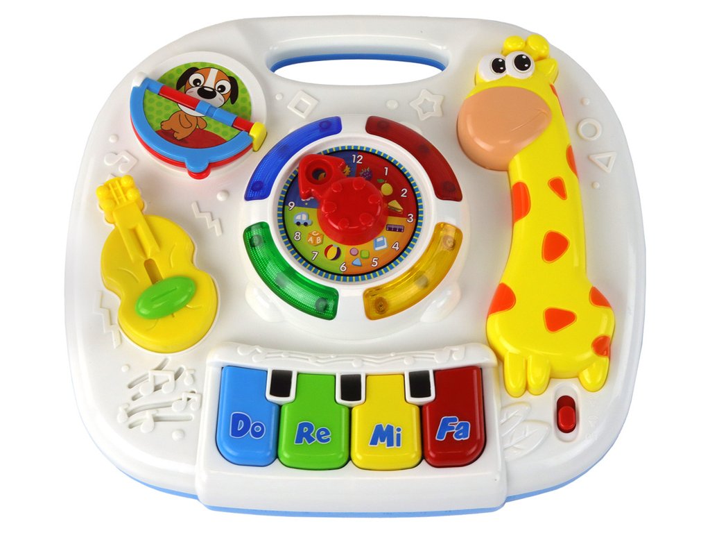 Vzdelávacia doska má aj mnoho ďalších prvkov, ktoré stimulujú zmysly a rozvíjajú kognitívne schopnosti. Malé klavírne klávesy podnecujú k objavovaniu zvukov, žltá žirafa a gitara rozvíjajú záujem o hudobné nástroje a malá knižka s otočnými stránkami pomáha deťom spoznávať zvieratá.