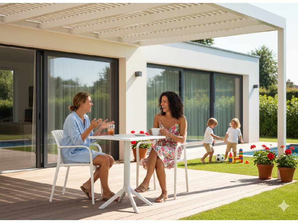 Jednotná farebná schéma a univerzálny tvar nábytku vám umožnia dosiahnuť harmonické usporiadanie, ktoré sa perfektne hodí do moderných aj klasických vonkajších priestorov.