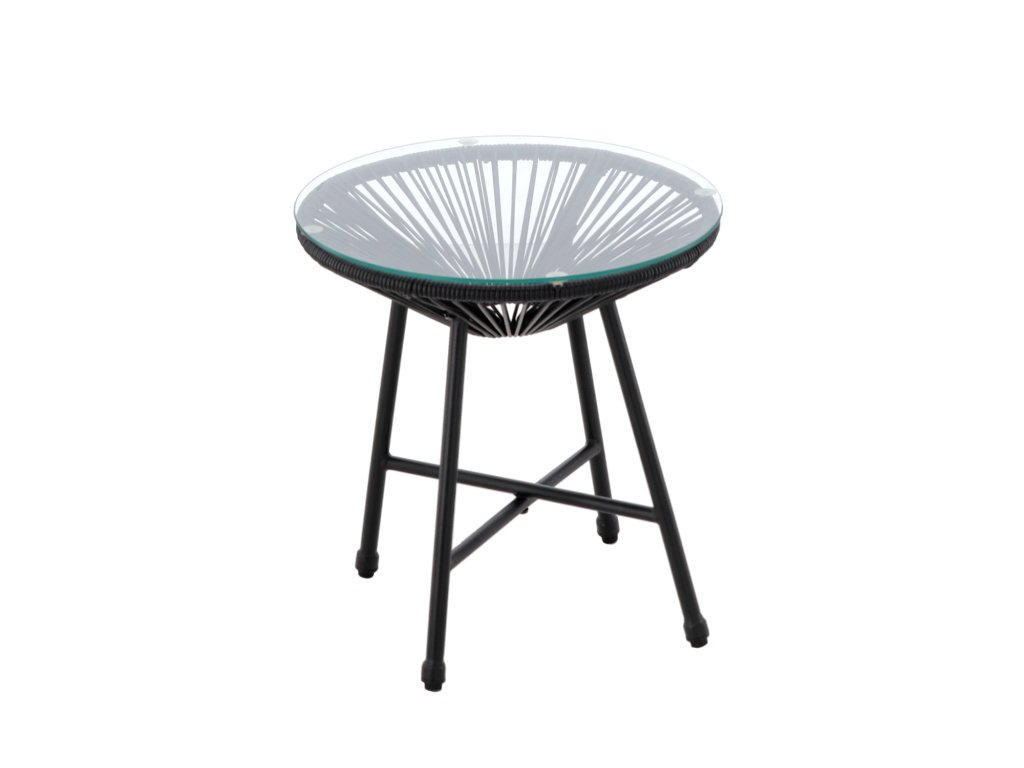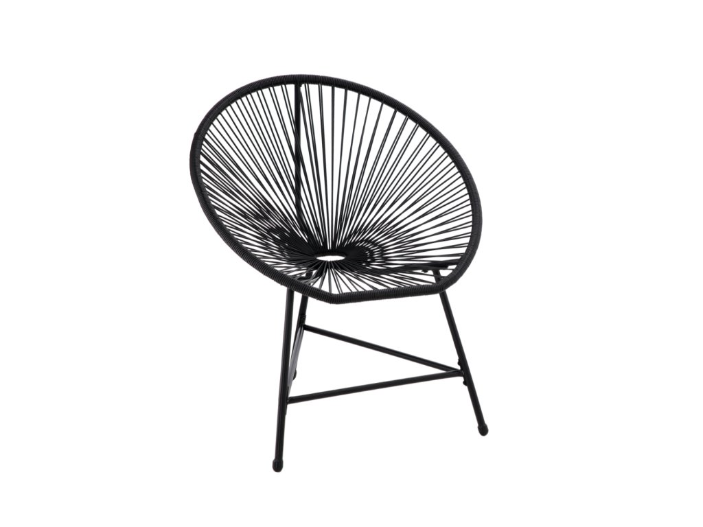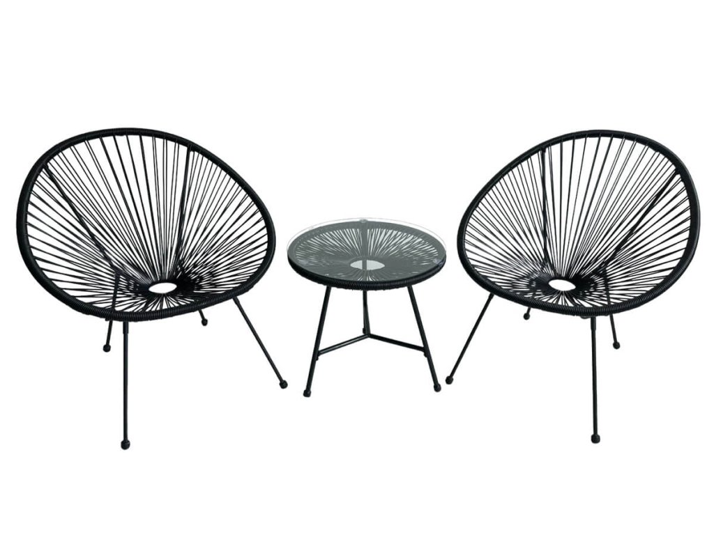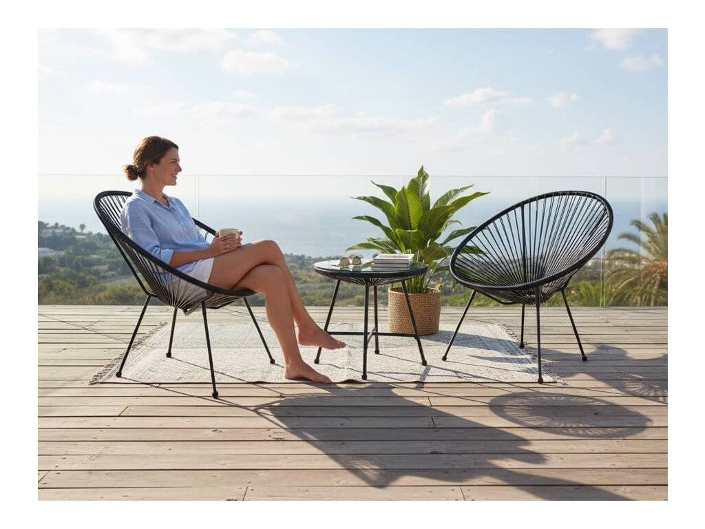 Štýlová a funkčná sada záhradného nábytku v čiernej farbe. Skladá sa z dvoch pohodlných stoličiek a elegantného okrúhleho stola so sklenenou doskou. Je vyrobená z vysoko kvalitných materiálov, ktoré zaručujú jej odolnosť a odolnosť voči poveternostným vplyvom. Vynikajúca voľba do záhrady, na balkón alebo terasu.