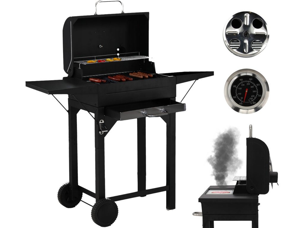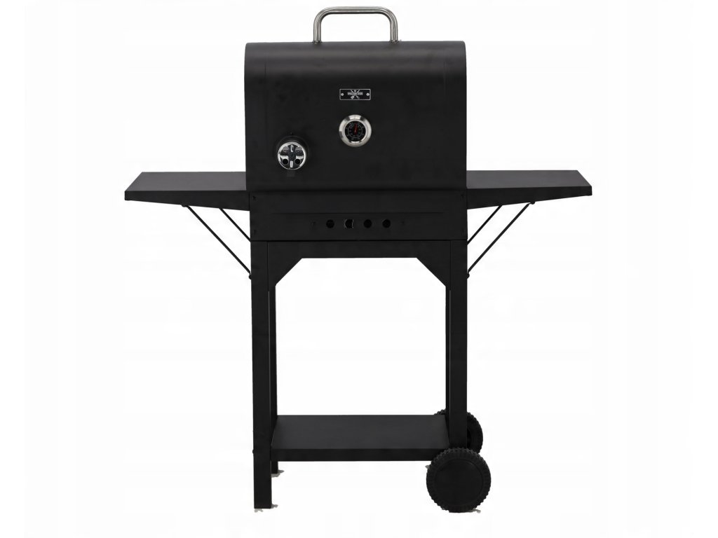 Gril je vybavený dvoma skladacími bočnými policami, spodnou chrómovanou policou a praktickým vysúvacím popolníkom pre jednoduché čistenie. Zabudovaný teplomer vo veku umožňuje presnú kontrolu teploty grilovania až do 300 °C a otvárač fliaš sa hodí na každú vonkajšiu párty. Stabilná konštrukcia s tromi nohami a dvoma kolieskami zaručuje mobilitu a jednoduché presunutie grilu na záhrade či terase.