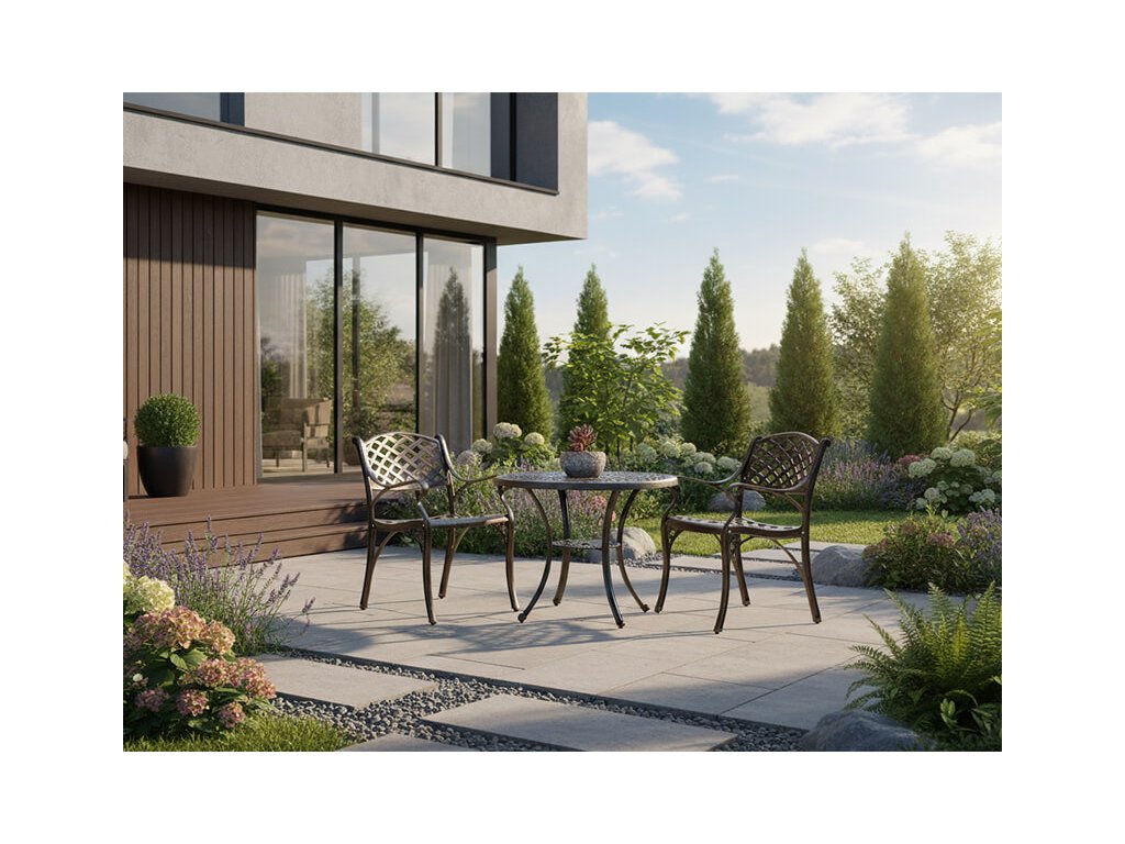 Okrúhly záhradný stôl Mondrich je vyrobený z masívneho liateho hliníka, ktorý zabezpečuje vysokú pevnosť, stabilitu a zároveň nízku hmotnosť. Vďaka tomu sa stôl jednoducho premiestňuje, no zostáva pevný aj pri každodennom používaní. Povrchová prášková úprava hliníka chráni konštrukciu pred koróziou, dažďom, slnkom aj mrazom, čo z neho robí spoľahlivý vonkajší nábytok na dlhé roky bez náročnej údržby.