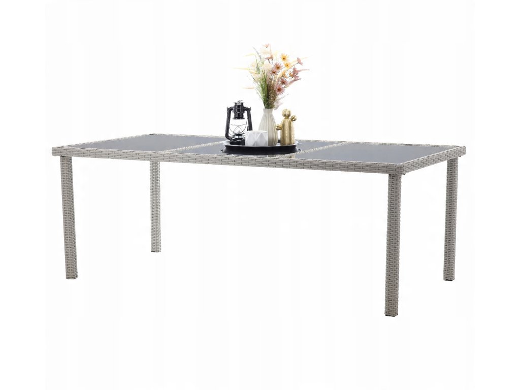 Elegantná jedálenská sada pozostávajúca z 8 stoličiek a veľkého stola. Je vyrobená z vysoko kvalitných materiálov, ktoré zaručujú odolnosť a odolnosť voči poveternostným vplyvom. Pozinkovaný oceľový rám zaručuje stabilitu, zatiaľ čo ratan dodáva estetický nádych. Vodoodolný materiál vankúšov zvyšuje komfort a doska stola z tvrdeného skla zdôrazňuje moderný dizajn.