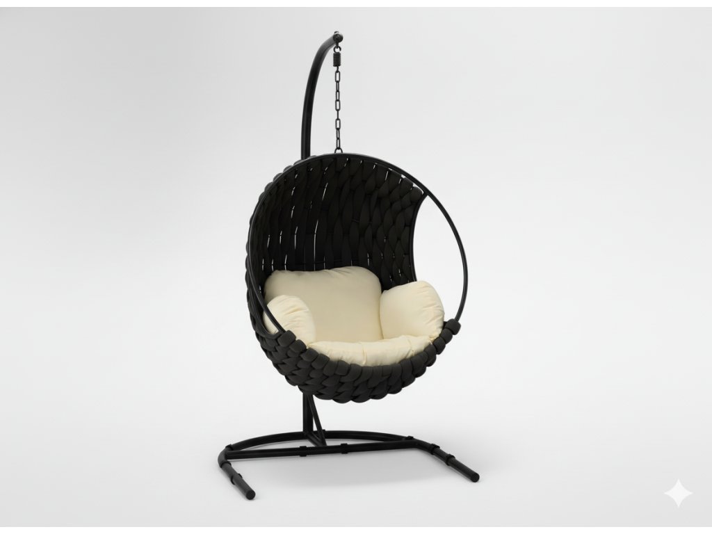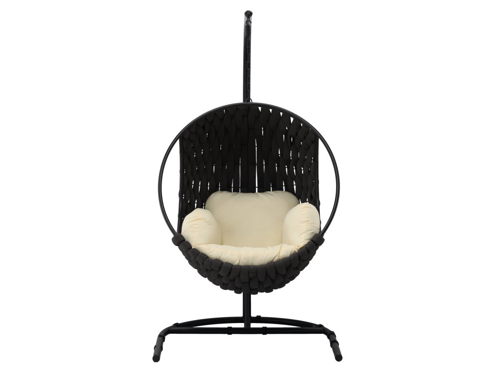 Elegantnosť, pohodlie a odolnosť – závesné kreslo TABANI v nadčasovej čiernej farbe s béžovým vankúšom spája všetky tieto vlastnosti. Je ideálne na relaxáciu v záhrade, na terase alebo aj v priestrannej obývačke.