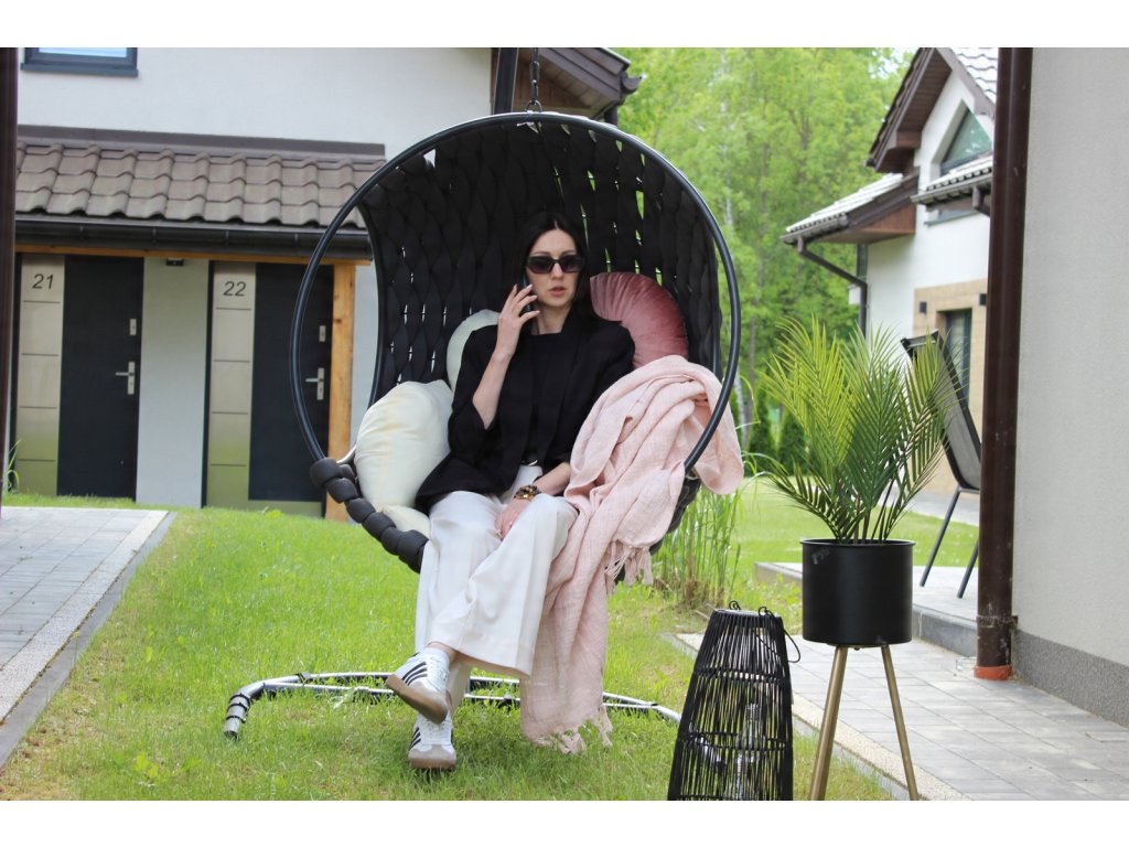 ZÁVESNÁ STOLIČKA TABANI – ČIERNA, BEŽOVÝ VANKÚŠ, ČIERNY RÁM