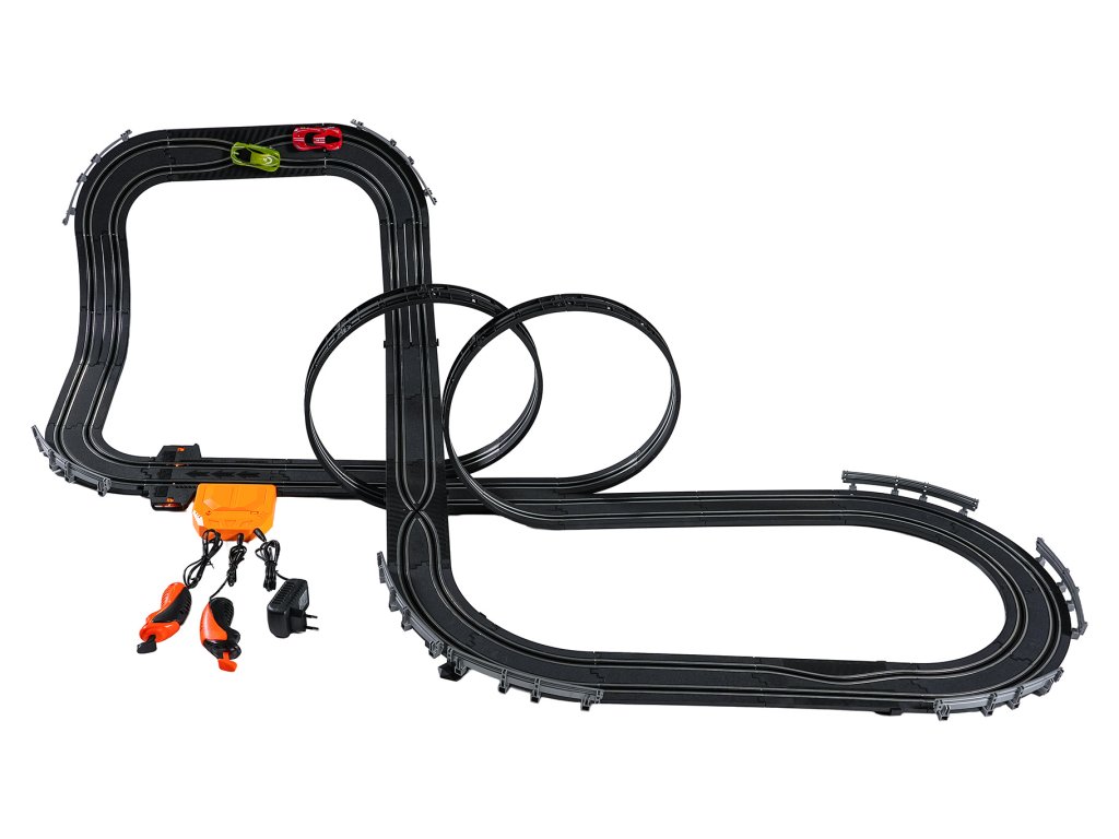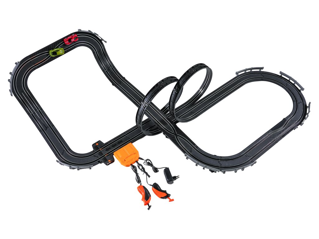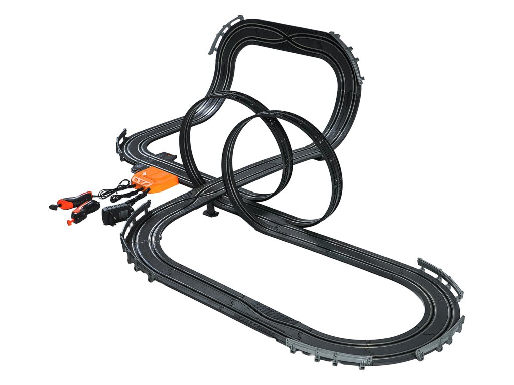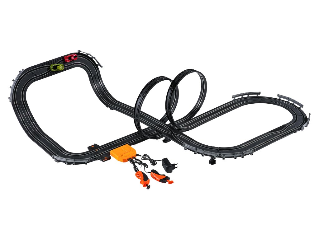 Veľká závodná dráha s dvoma diaľkovo ovládanými autami a vymeniteľnou karosériou pre deti od šiestich rokov. Táto sada umožňuje zostaviť dráhu s dvoma slučkami, ostrými zákrutami a rovnými úsekmi. Obsahuje dve autá, vymeniteľnú karosériu pre vozidlá a dva diaľkové ovládače. Dráha je napájaná zo sieťového zdroja alebo batérií. Sieťový zdroj 9 V je súčasťou balenia, 6 batérií AA 1,5 V nie je súčasťou balenia.