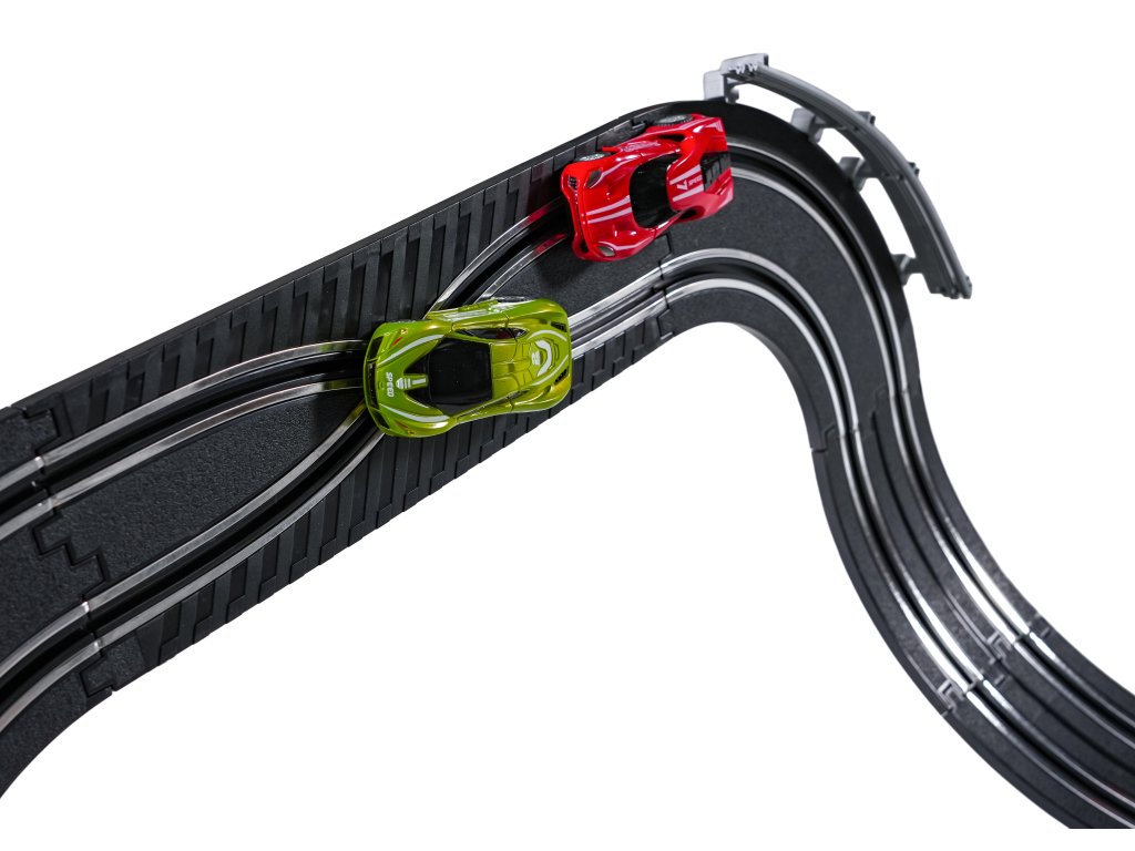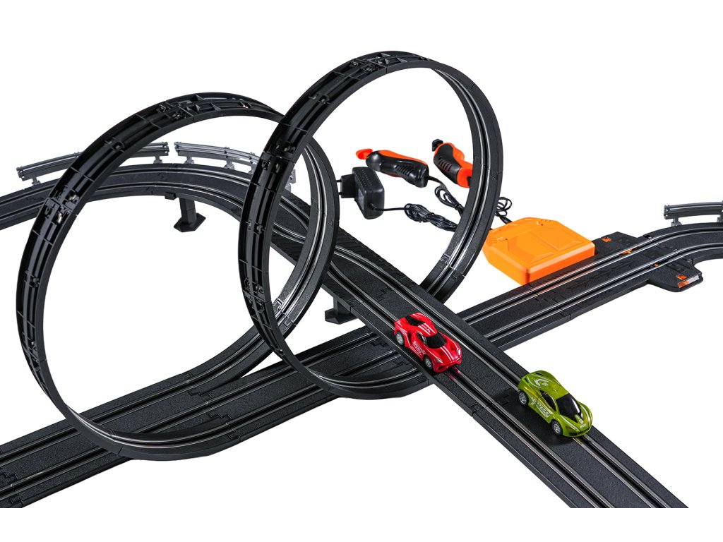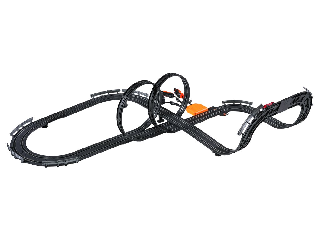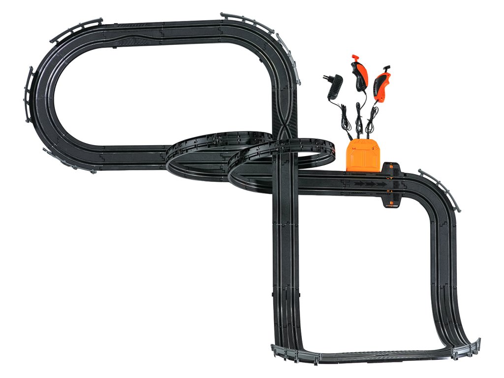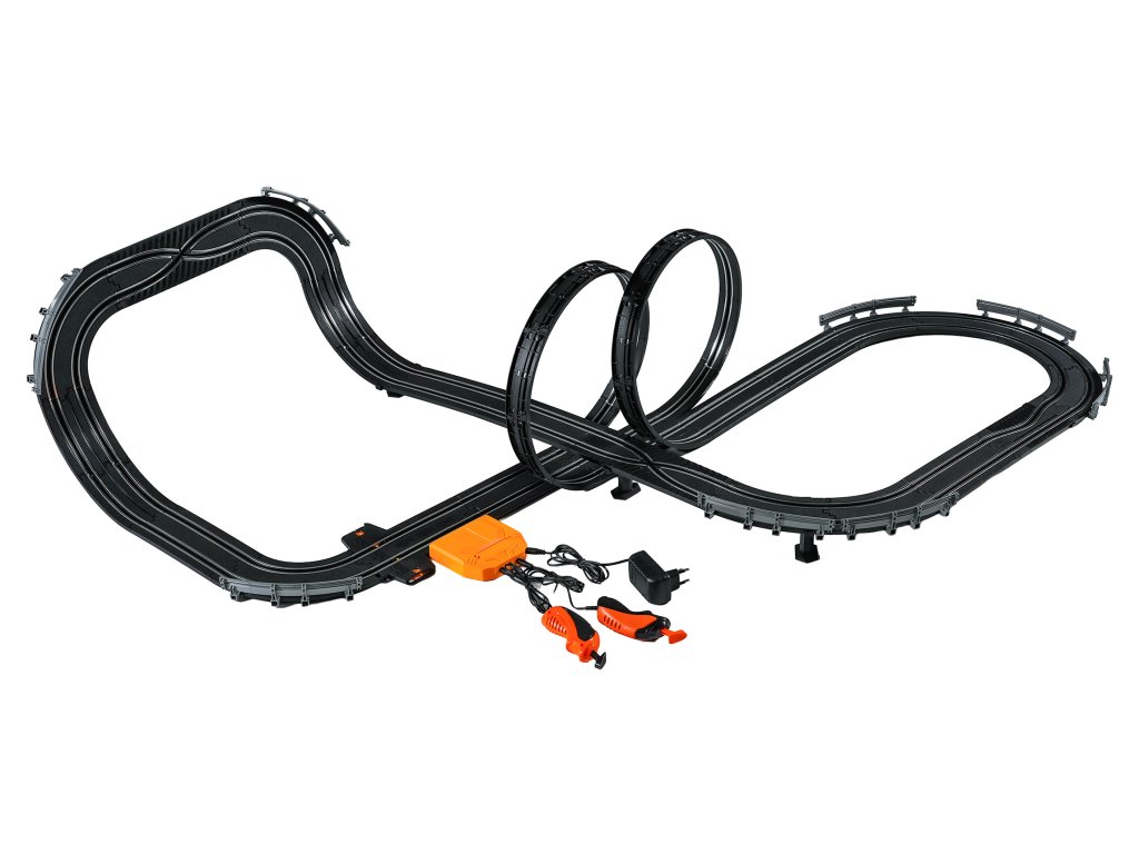 Veľká závodná dráha s dvoma diaľkovo ovládanými autami a vymeniteľnou karosériou pre deti od šiestich rokov. Táto sada umožňuje zostaviť dráhu s dvoma slučkami, ostrými zákrutami a rovnými úsekmi. Obsahuje dve autá, vymeniteľnú karosériu pre vozidlá a dva diaľkové ovládače. Dráha je napájaná zo sieťového zdroja alebo batérií. Sieťový zdroj 9 V je súčasťou balenia, 6 batérií AA 1,5 V nie je súčasťou balenia.